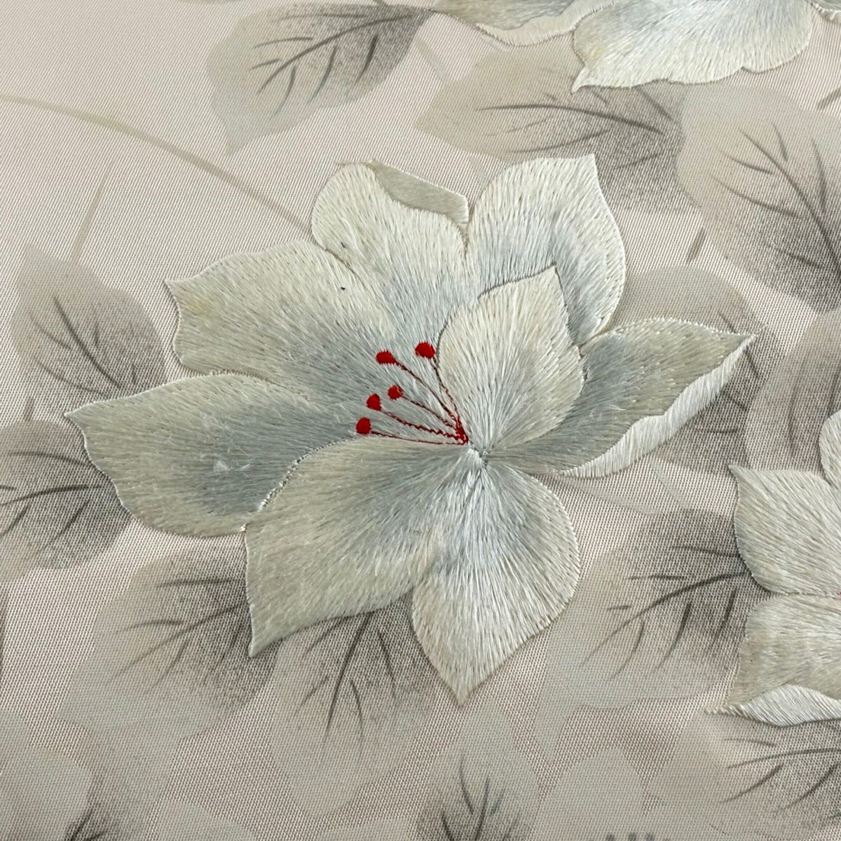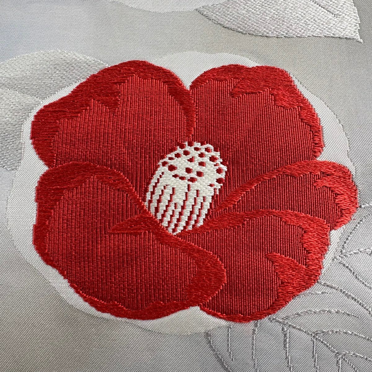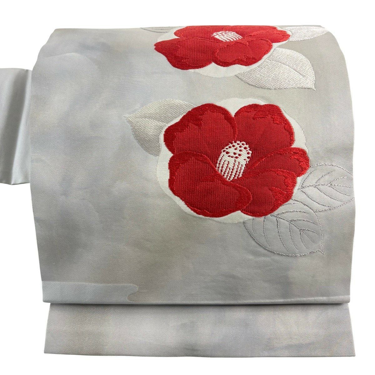 名古屋帯 優品 椿 霞 刺繍 箔 灰色 正絹