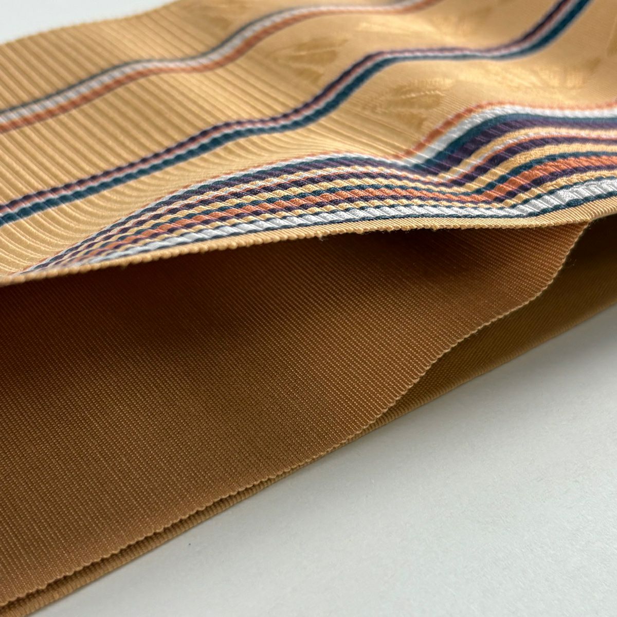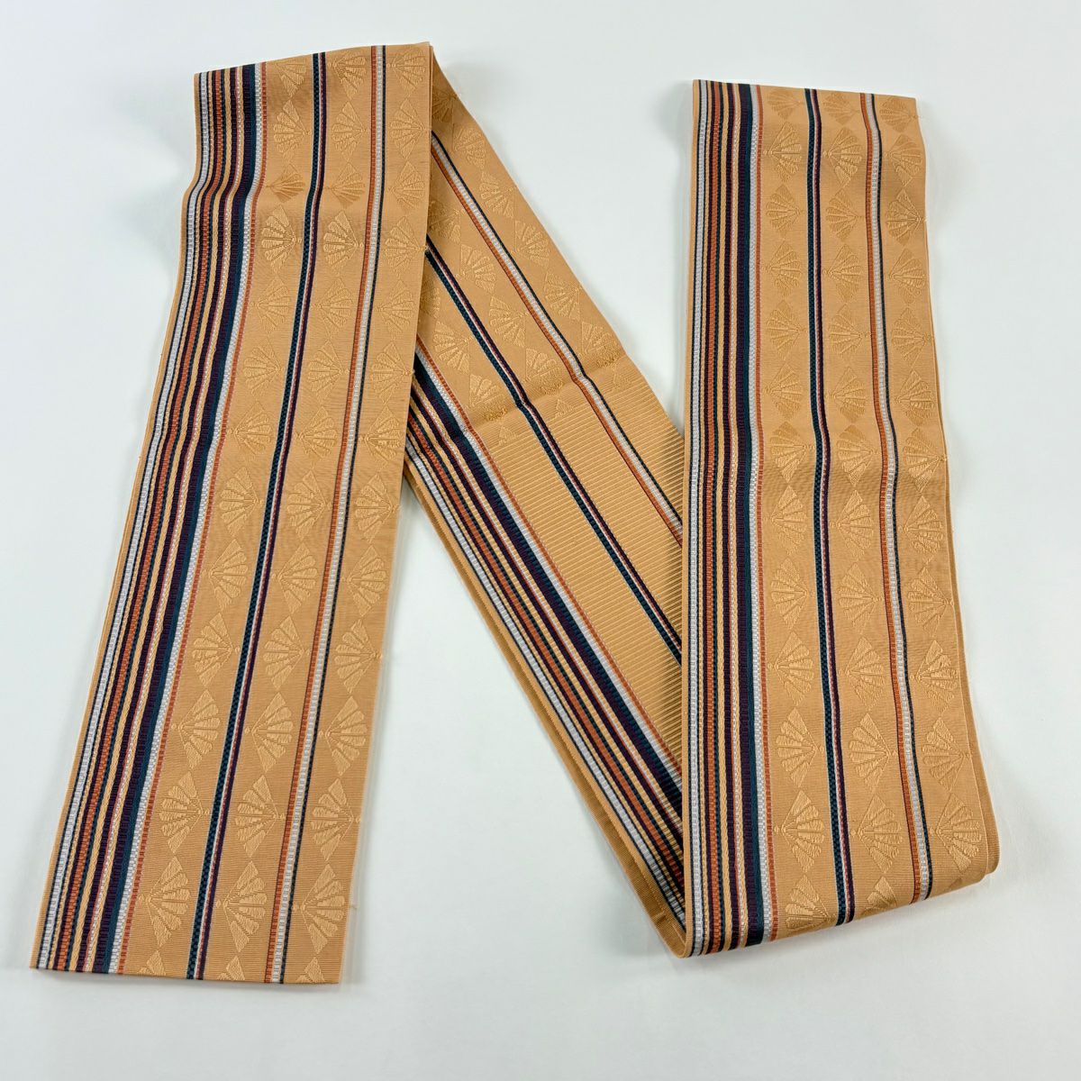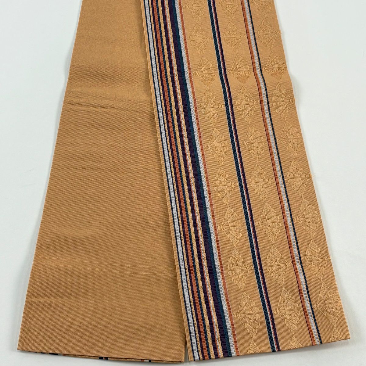 半幅帯 優品 ポケット付 扇 縞 薄茶色 正絹