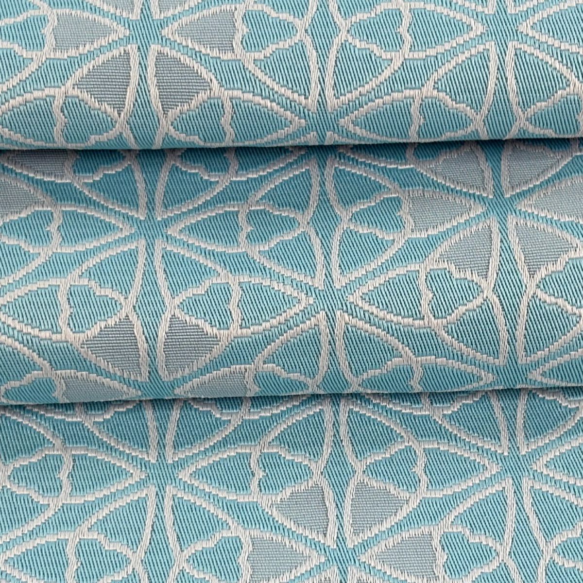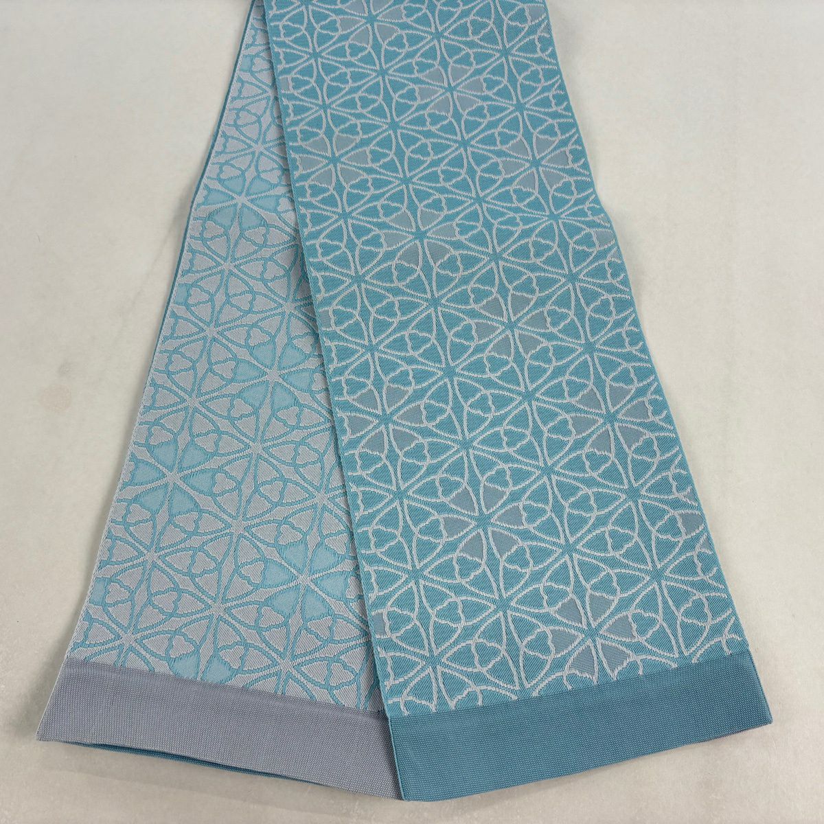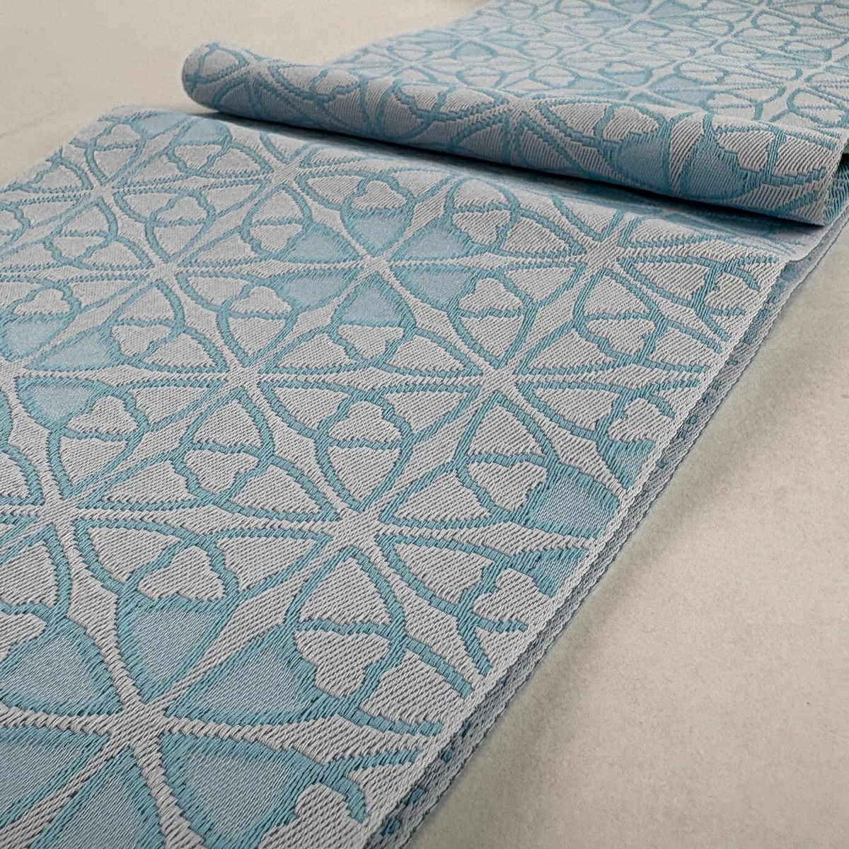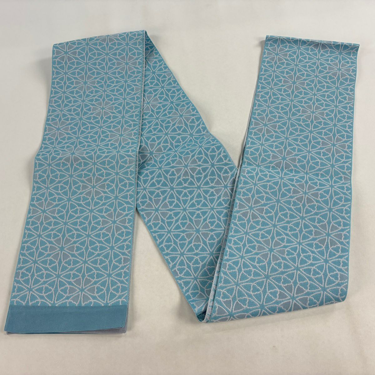 【美品】半幅帯 優品 花 幾何学模様 水色 化繊