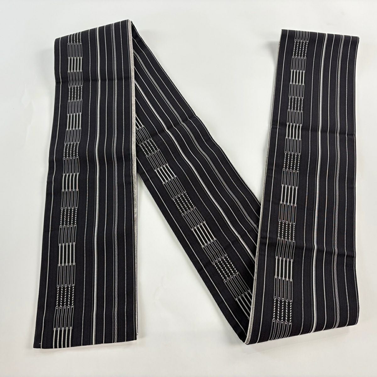 【美品】半幅帯 優品 縞 幾何学模様 濃紫 化繊