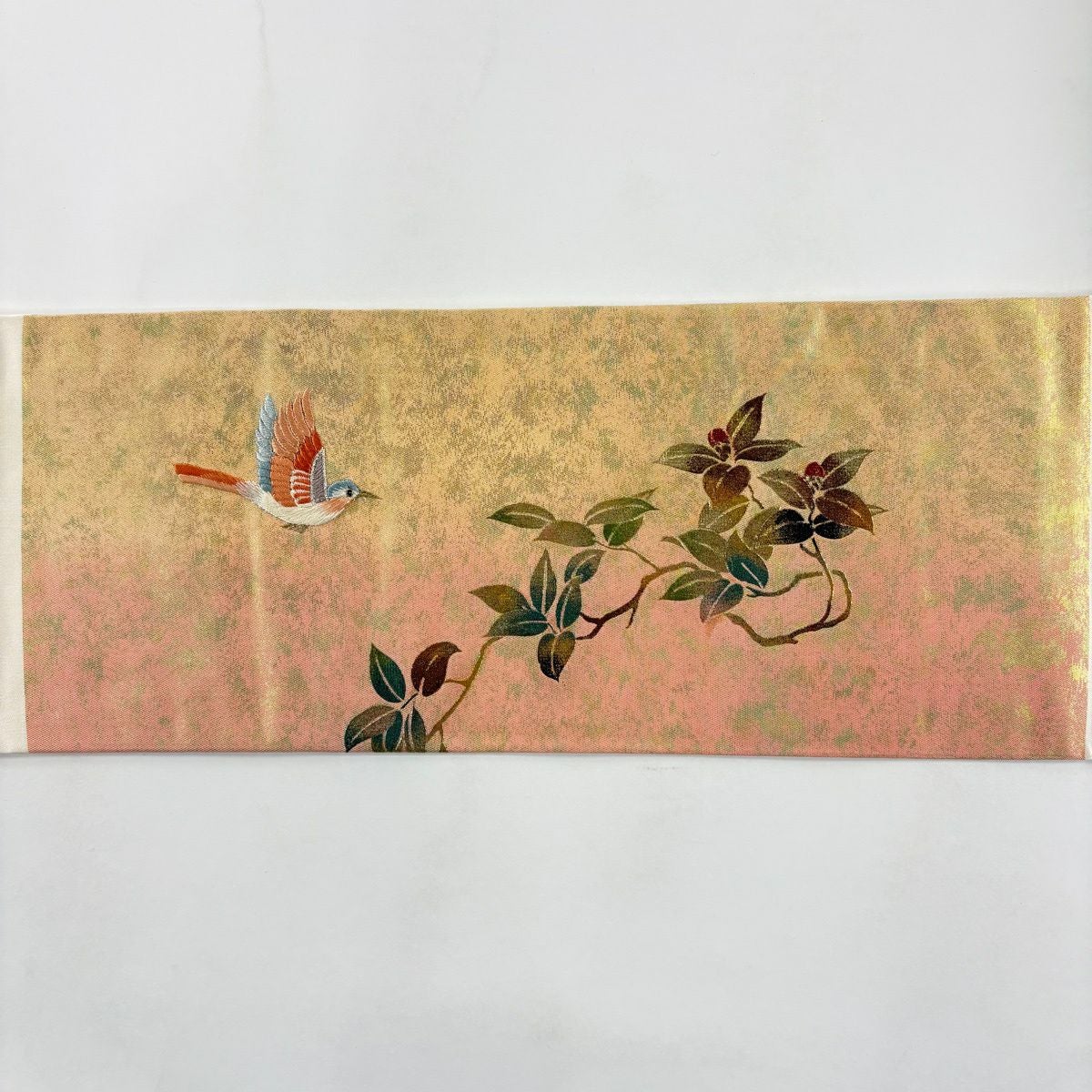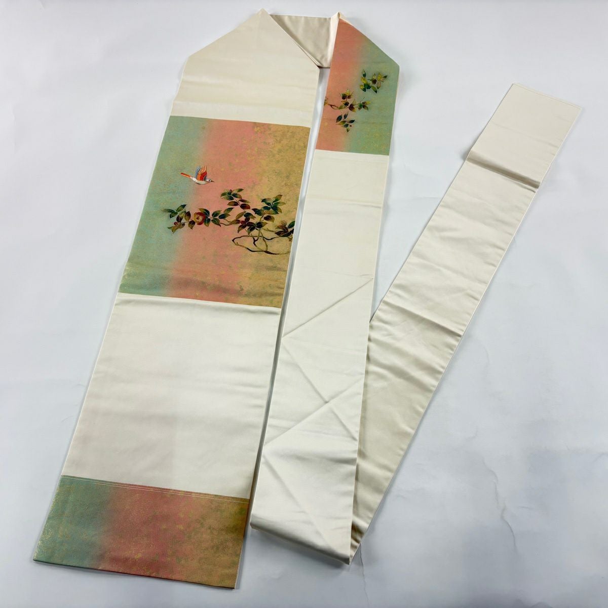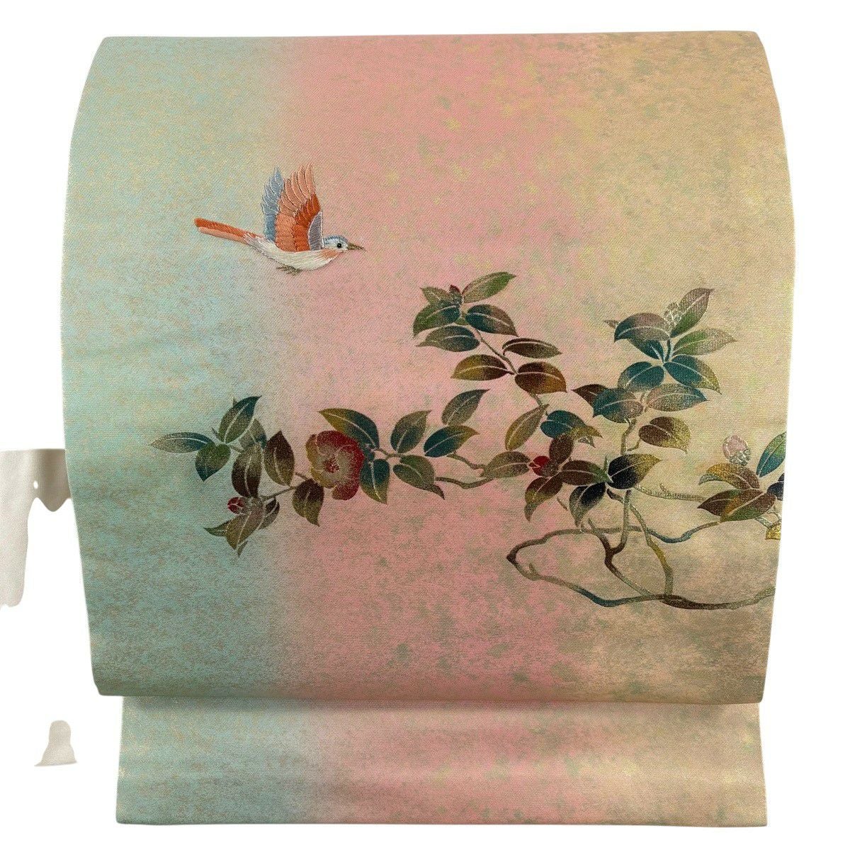 名古屋帯 優品 鳥 椿 刺繍 箔 ピンク 正絹
