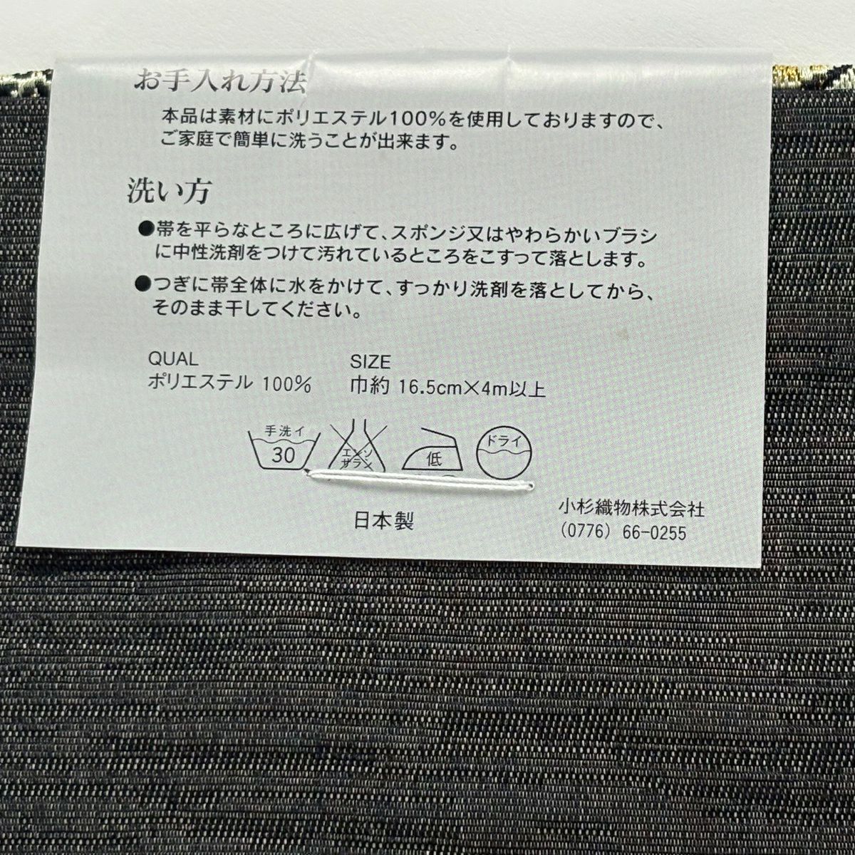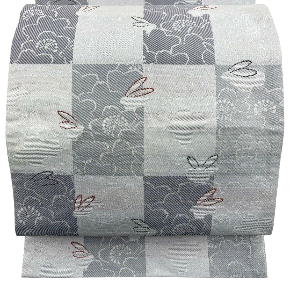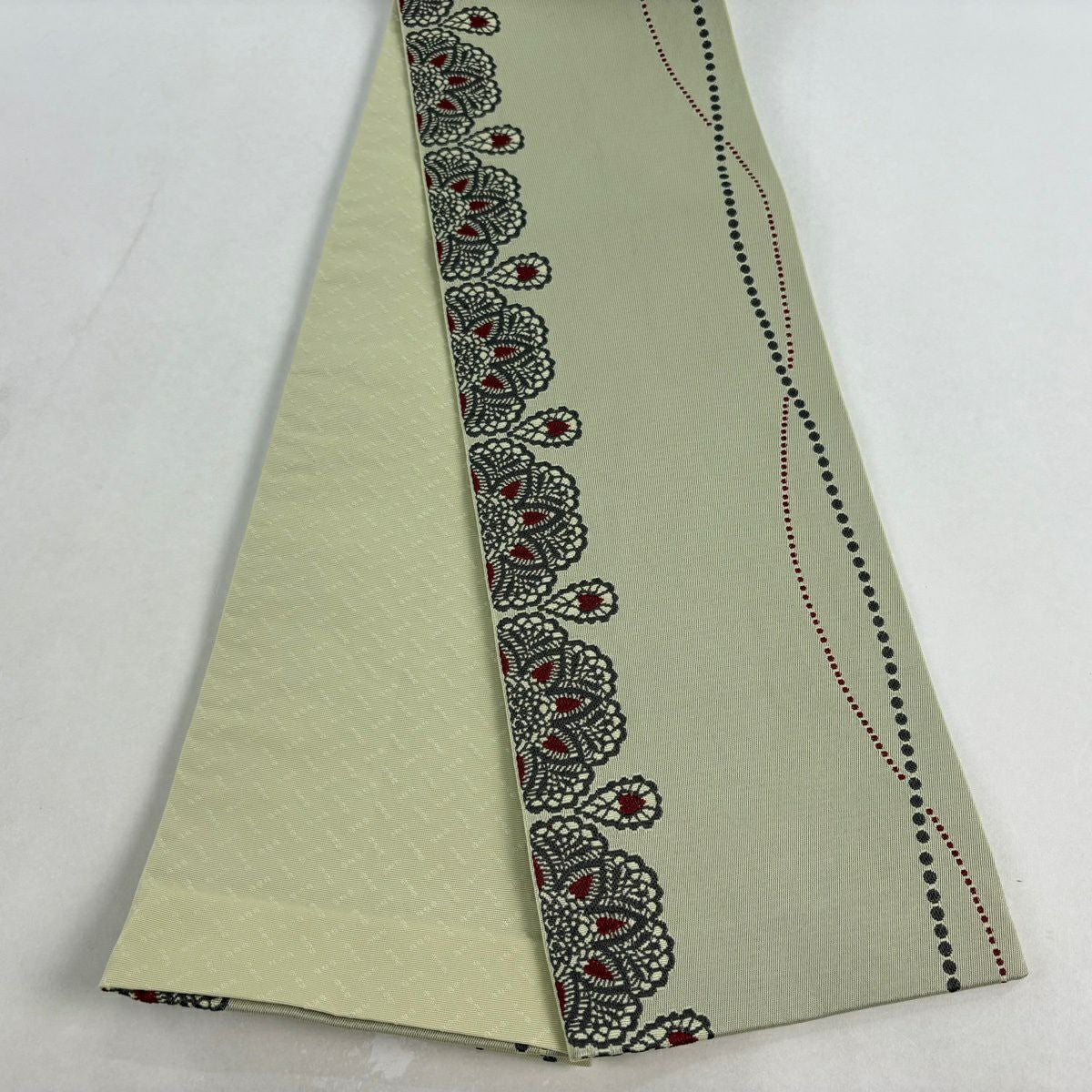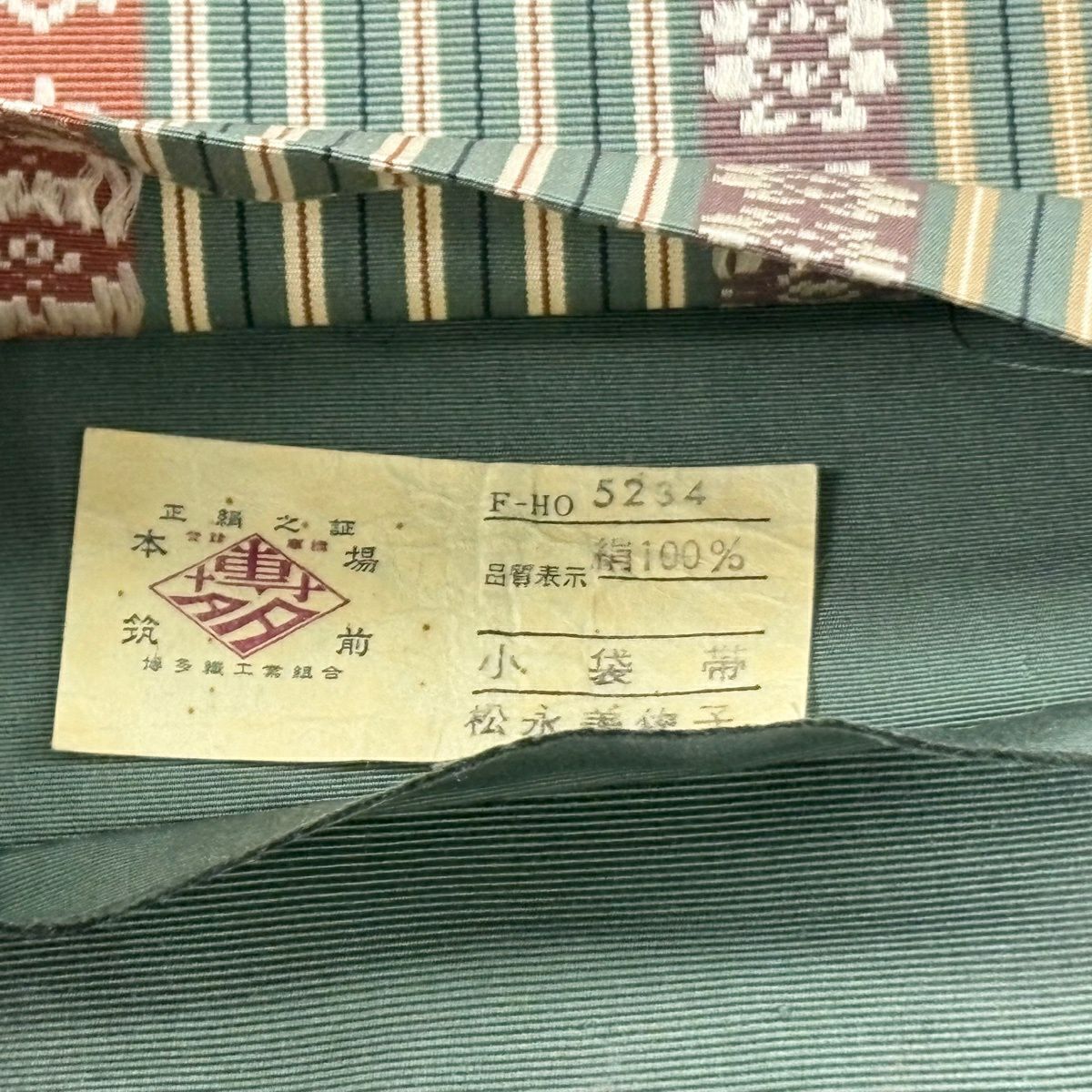 【美品】半幅帯 優品 華文 幾何学模様 灰緑 化繊