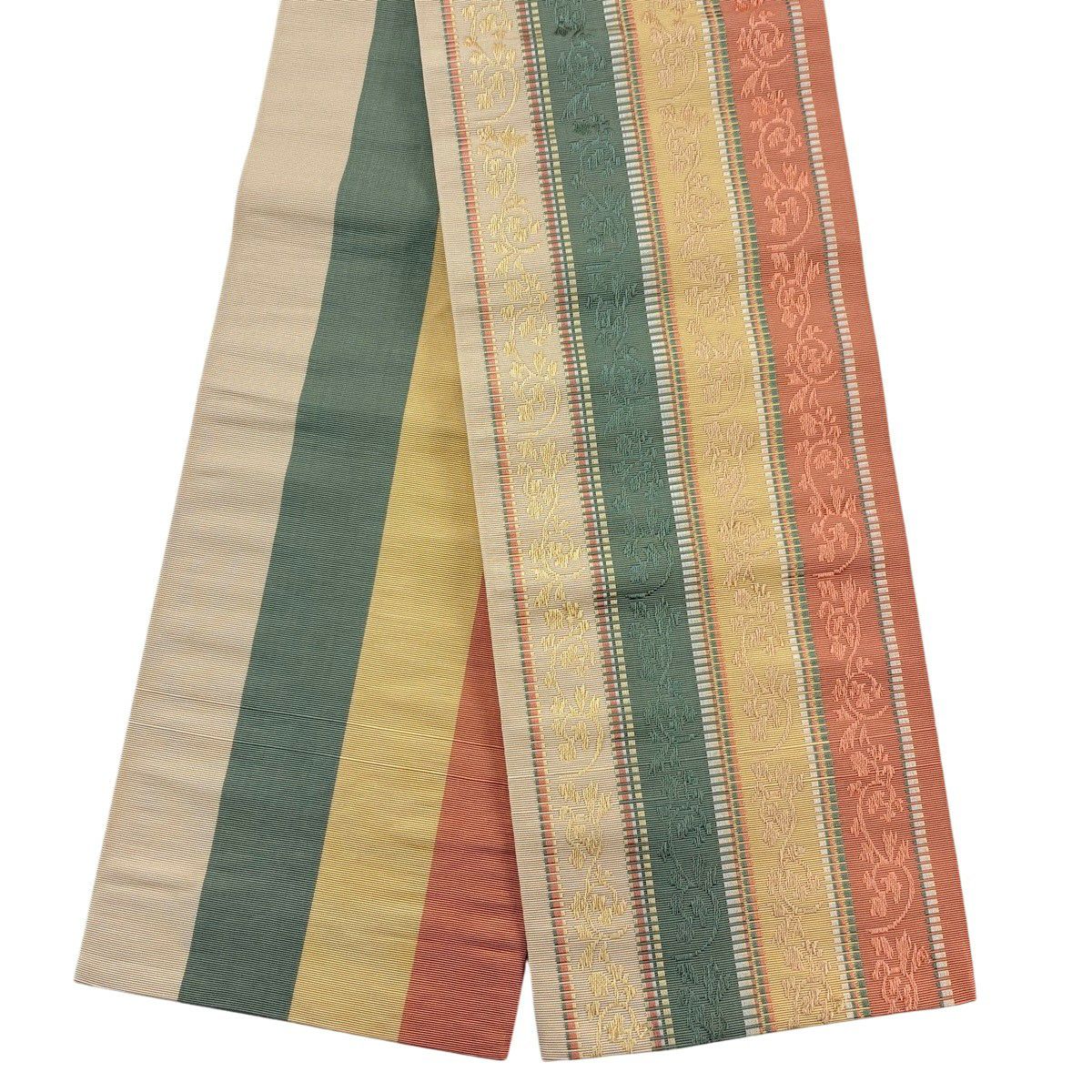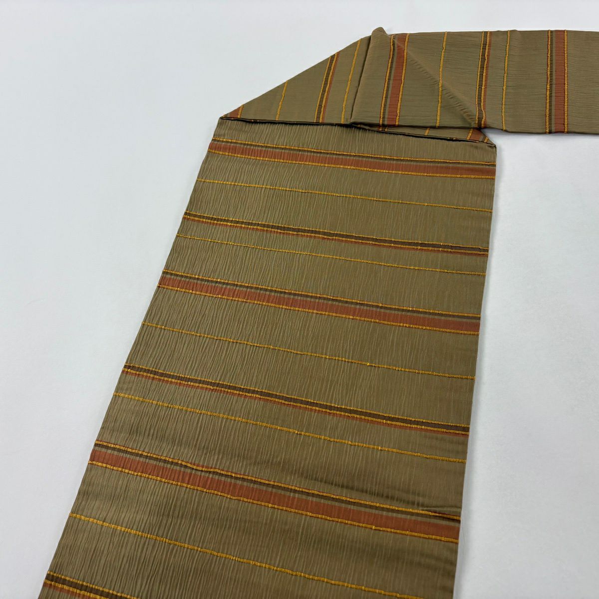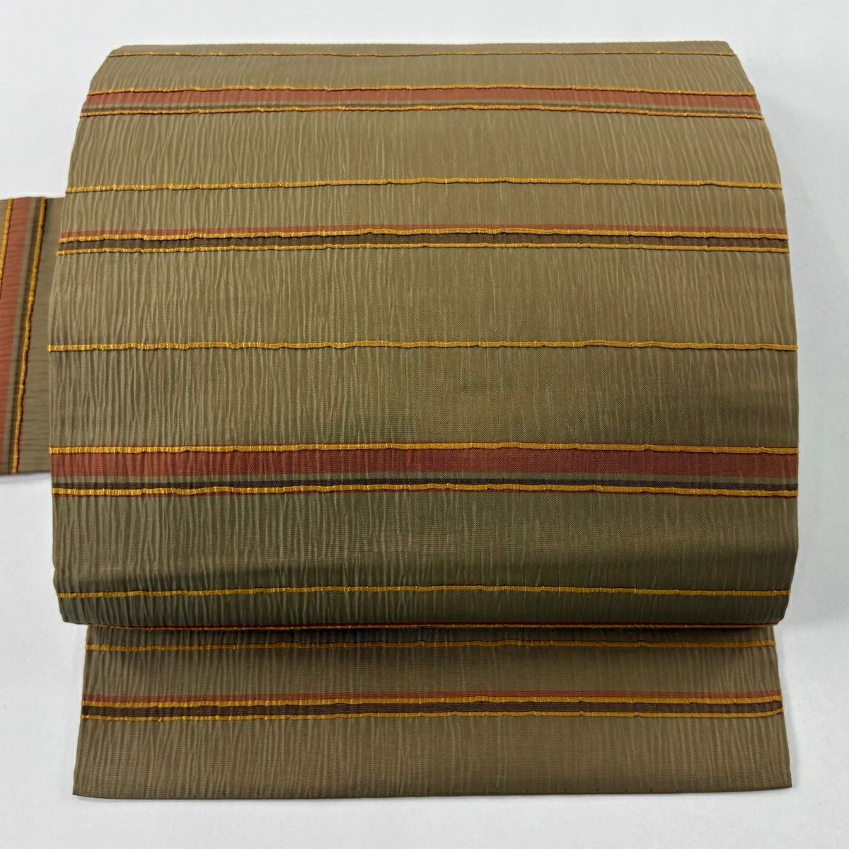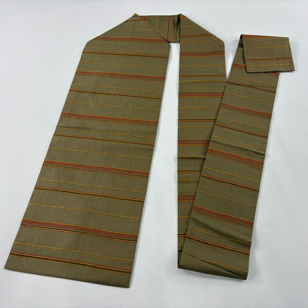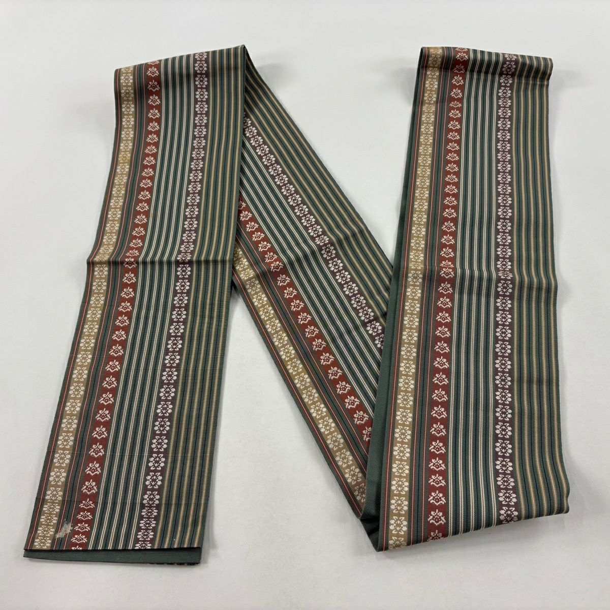 半幅帯 優品 博多織 証紙 縞 花 よもぎ色 正絹