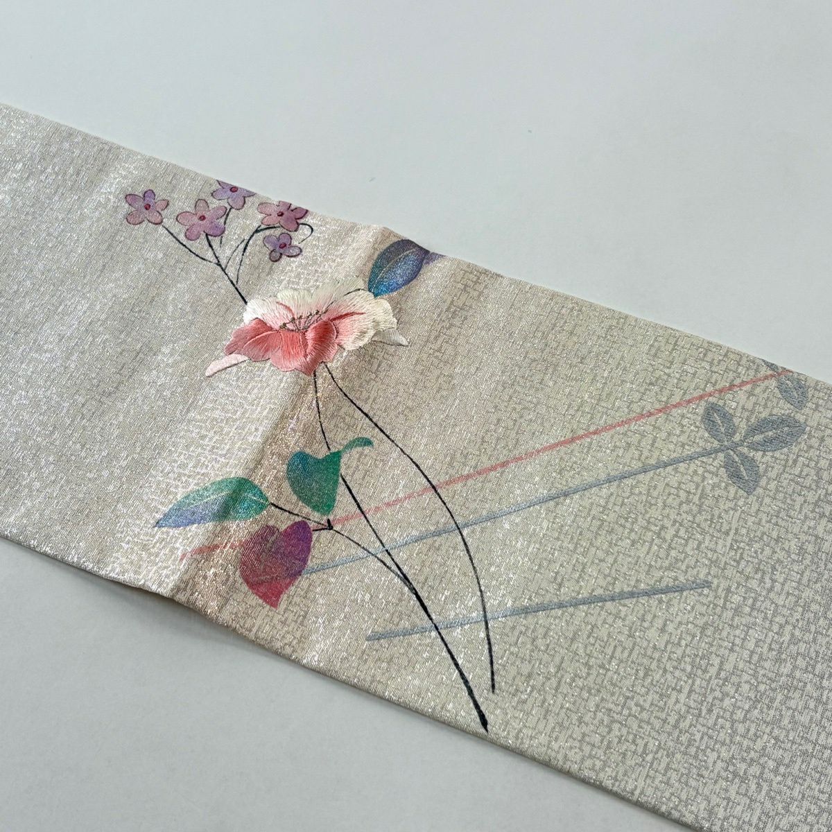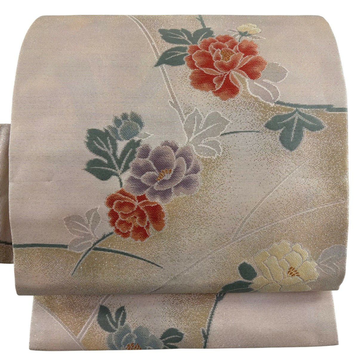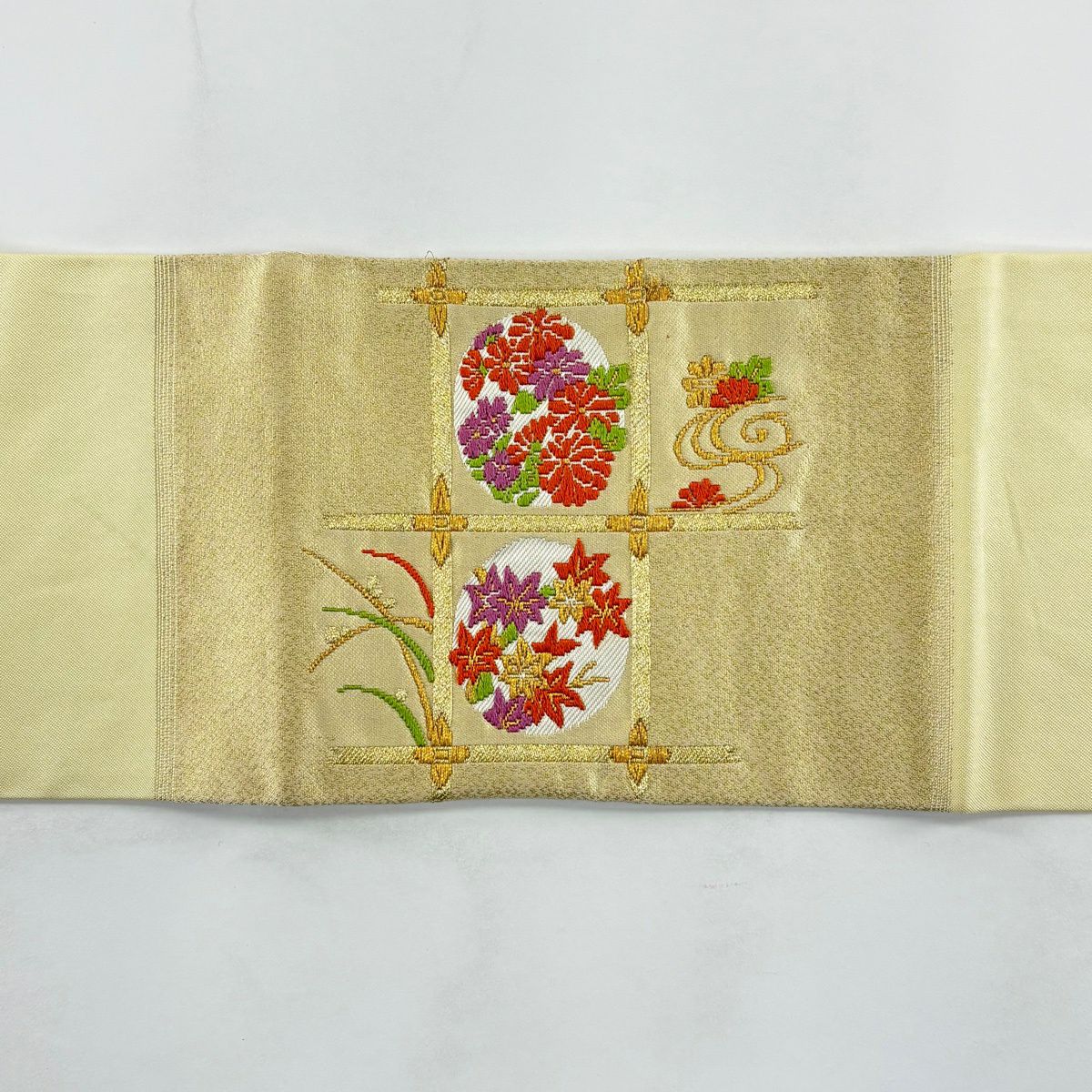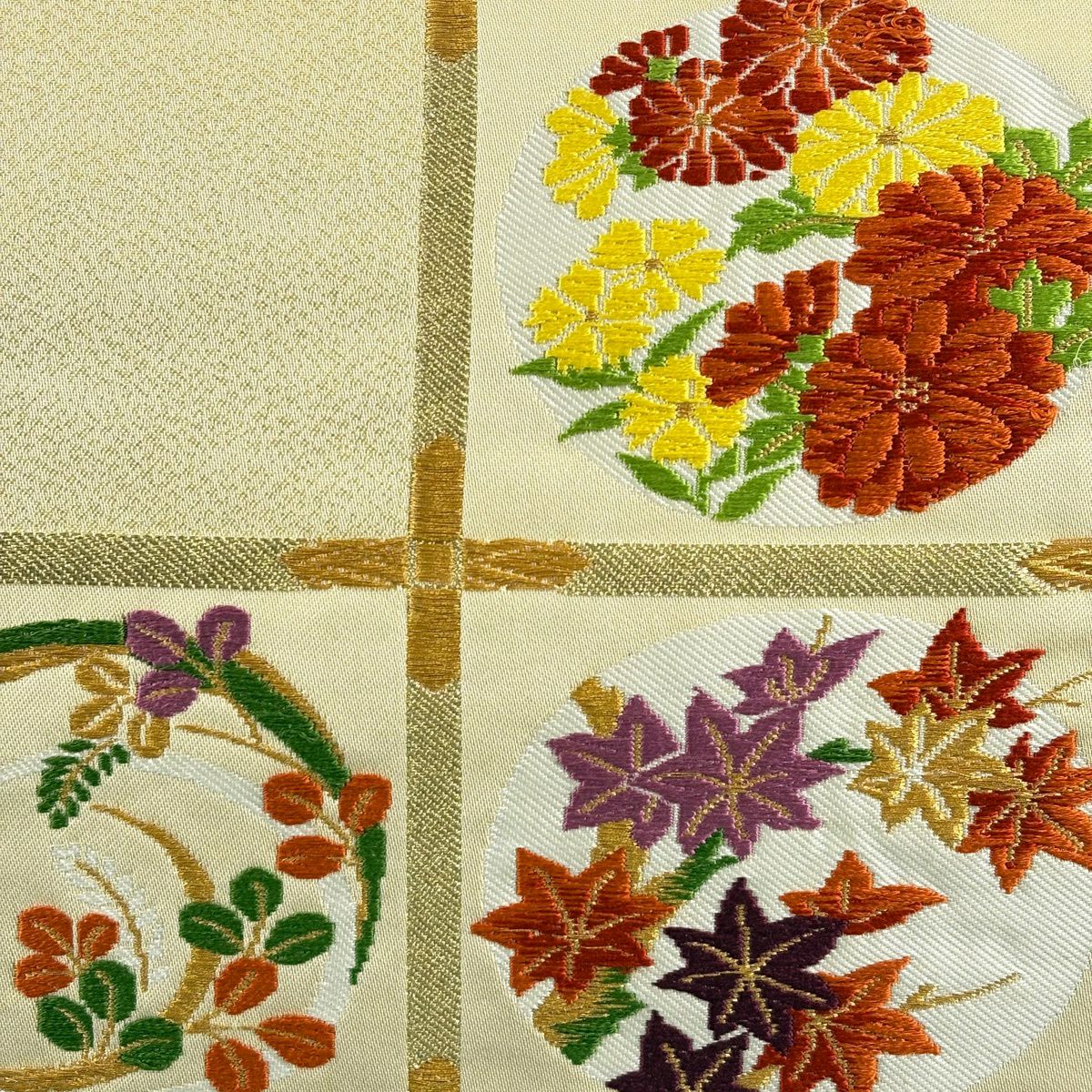 名古屋帯 優品 草花 金銀糸 刺繍 クリーム 正絹