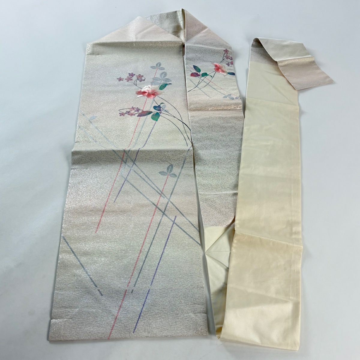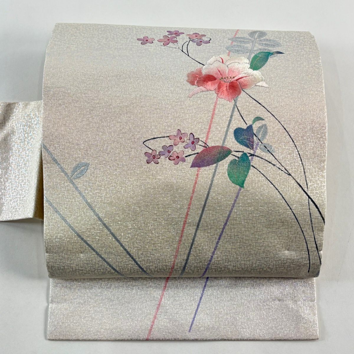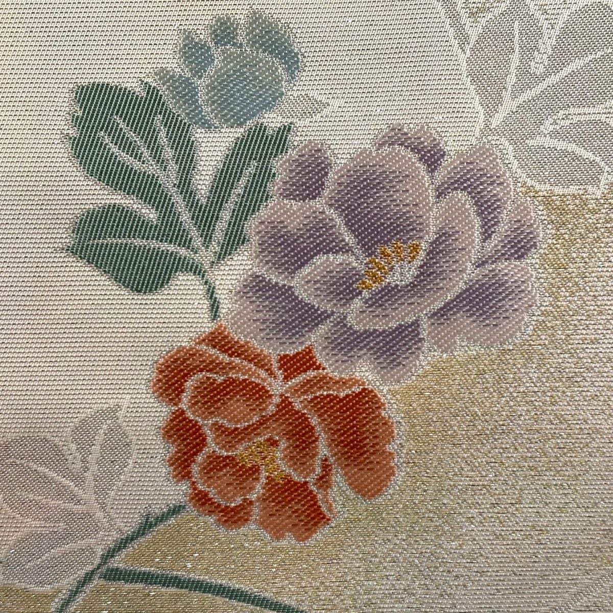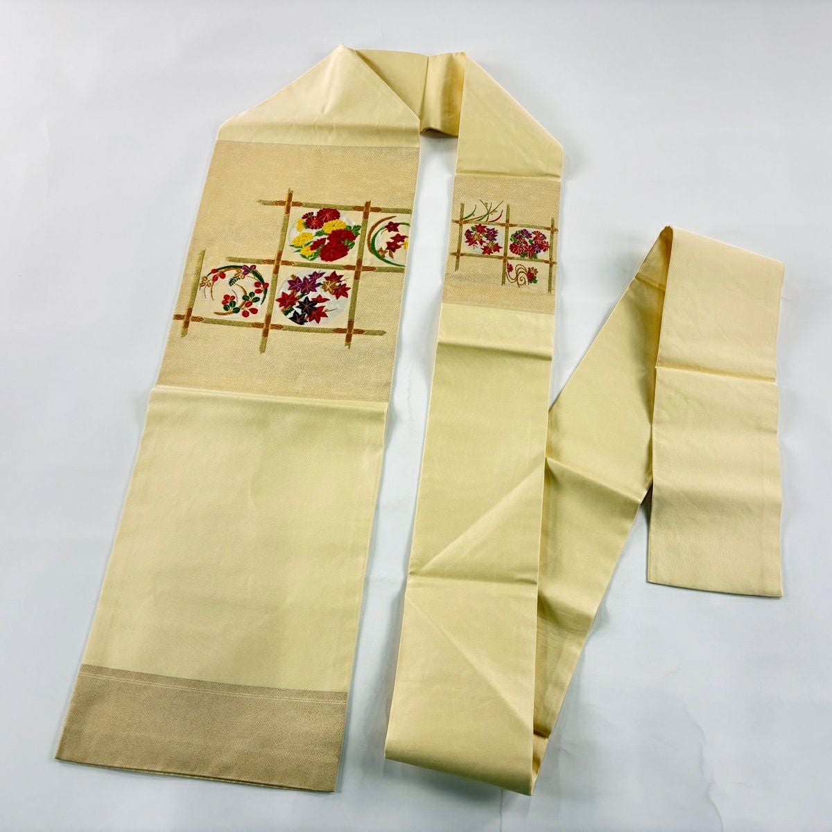 名古屋帯 優品 草花 金銀糸 刺繍 クリーム 正絹