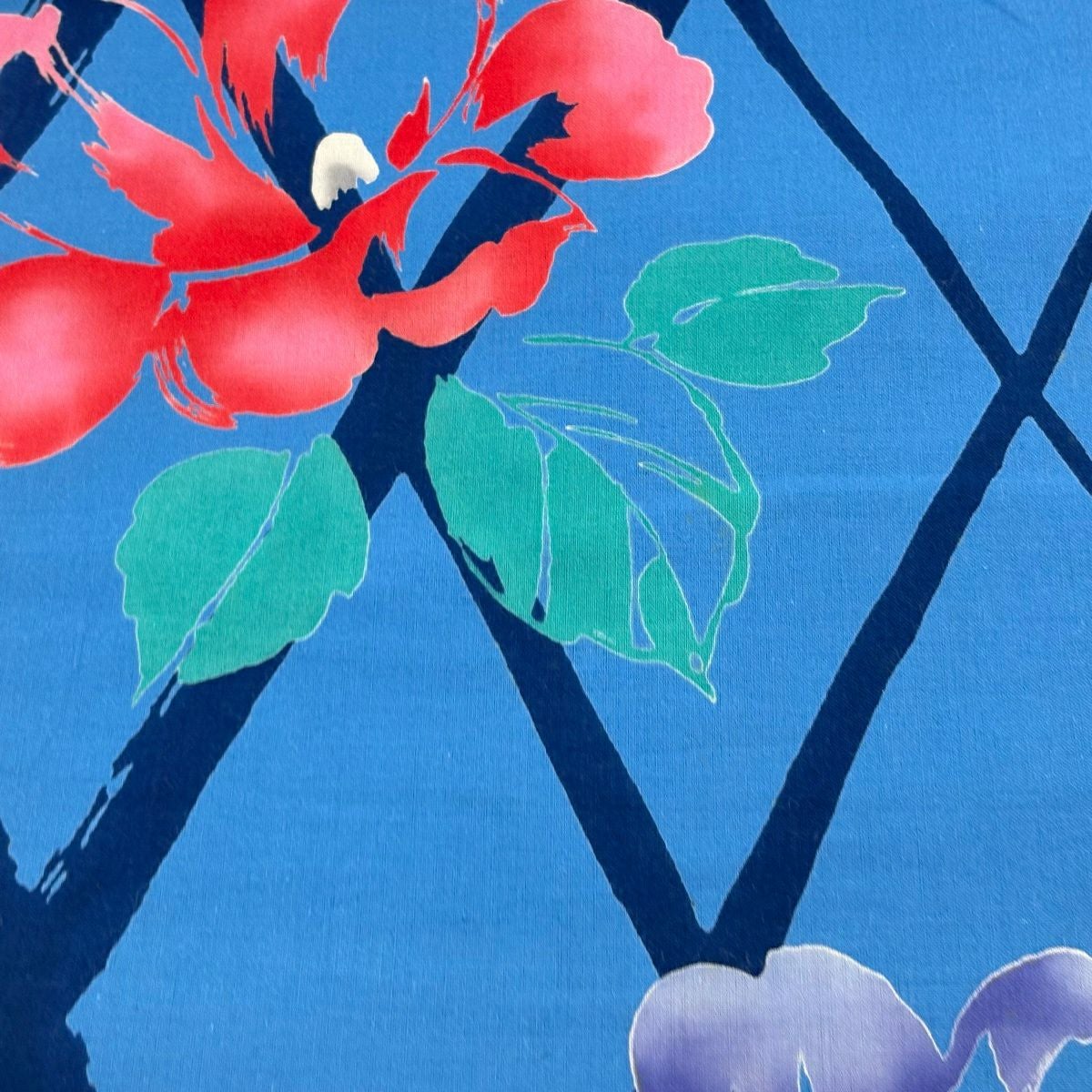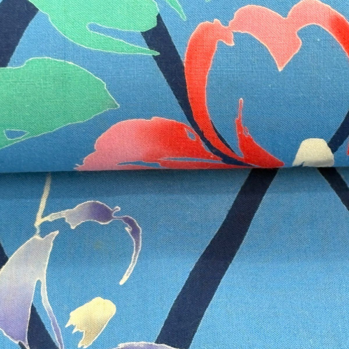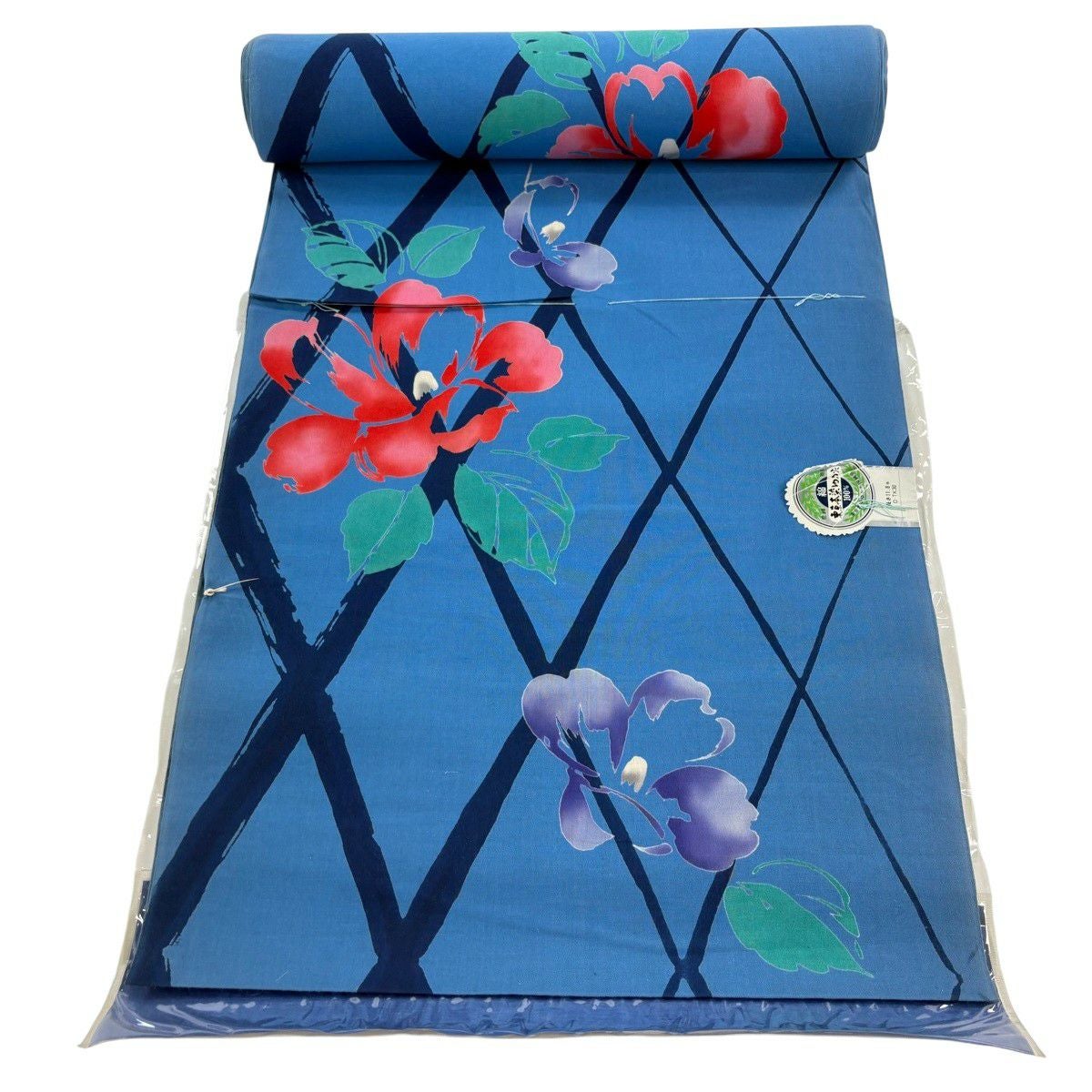 反物 優品 浴衣 丁子染 草花 斜め格子 水色 綿