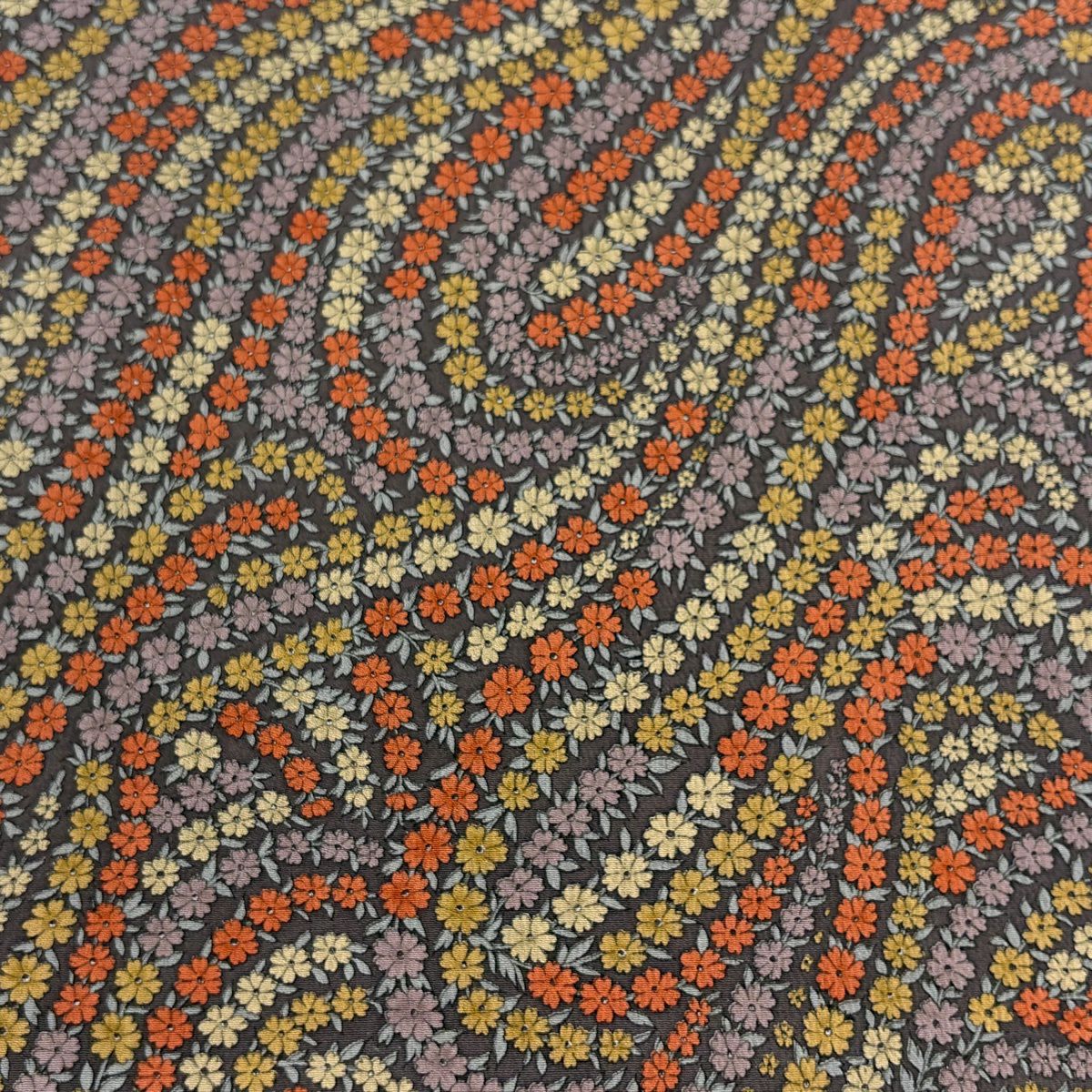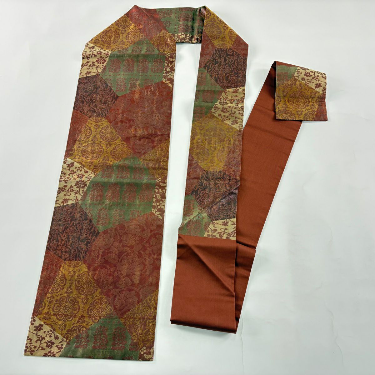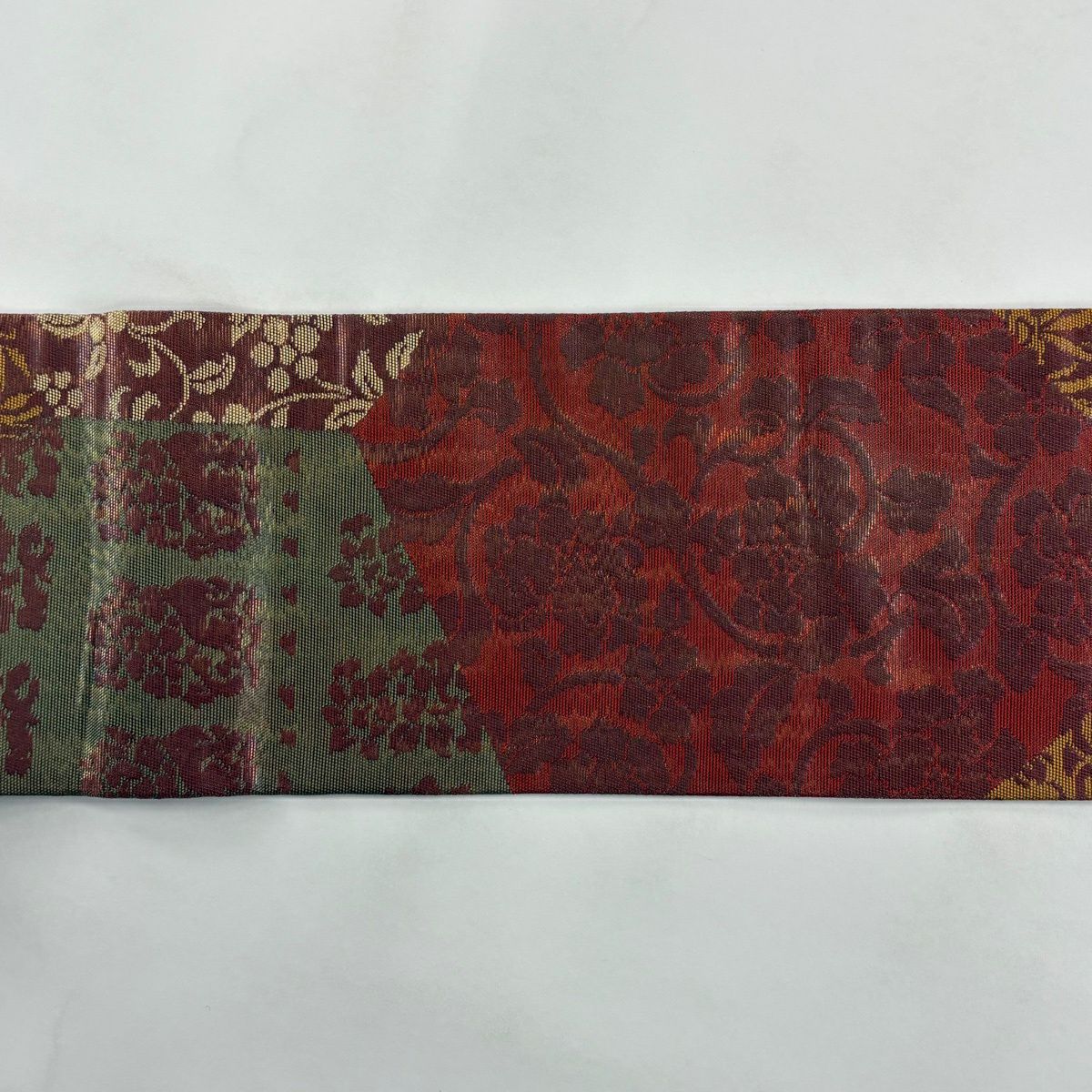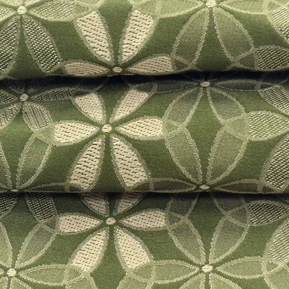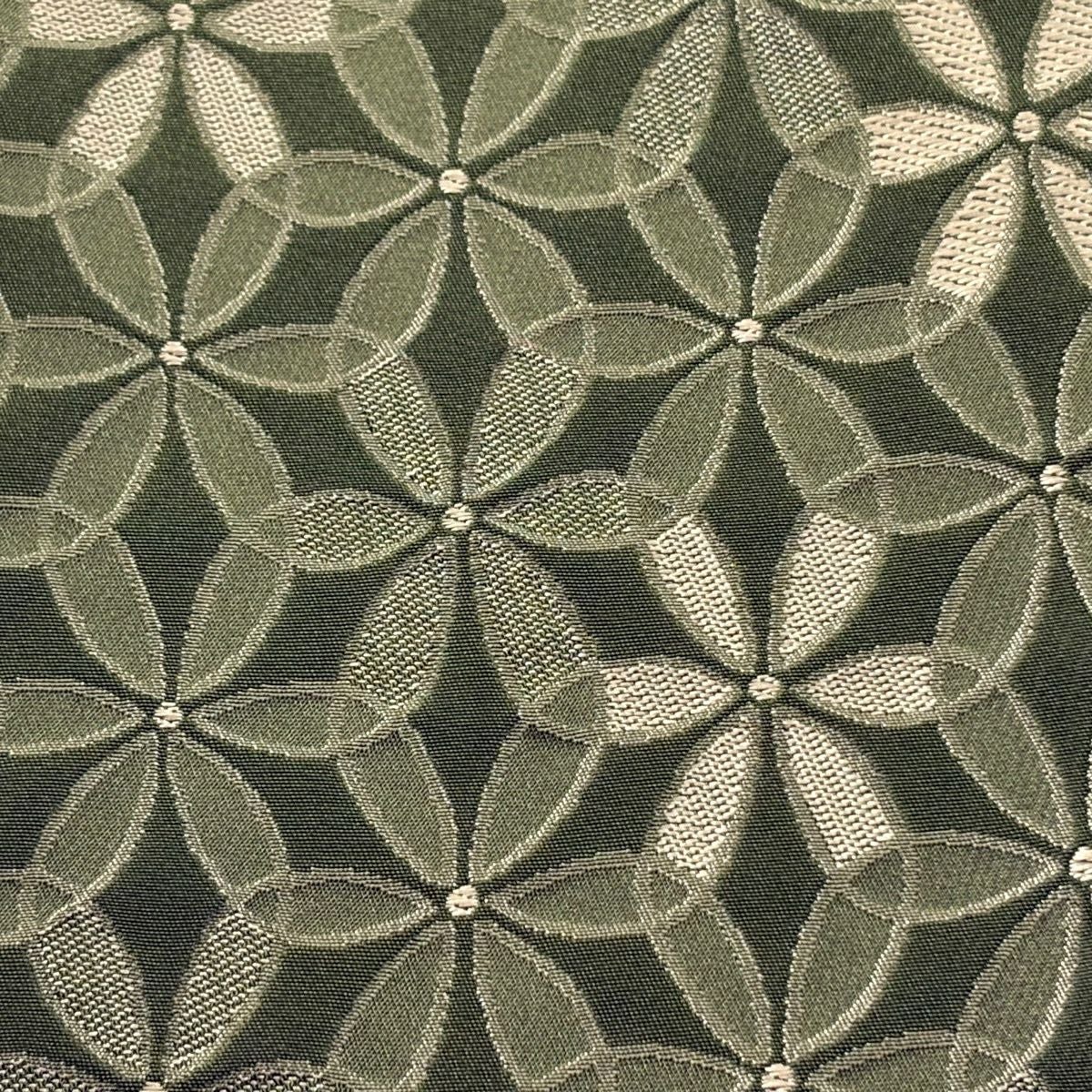 【美品】半幅帯 優品 花 幾何学模様 茶緑色 化繊