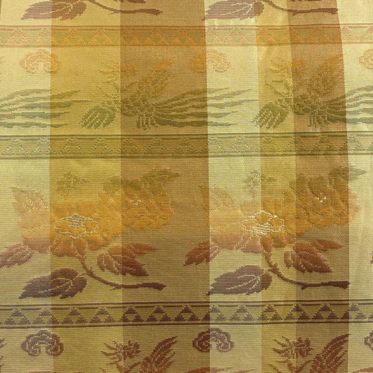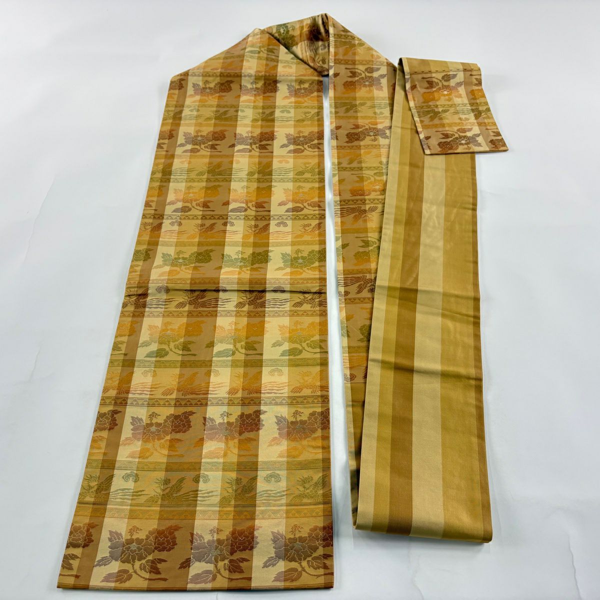【美品】 名古屋帯 優品 格子 花鳥 山吹色 正絹