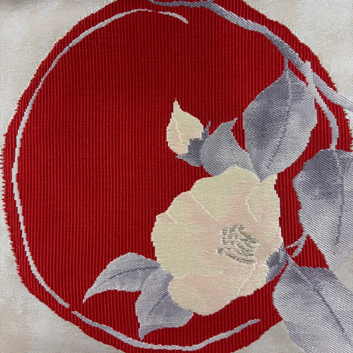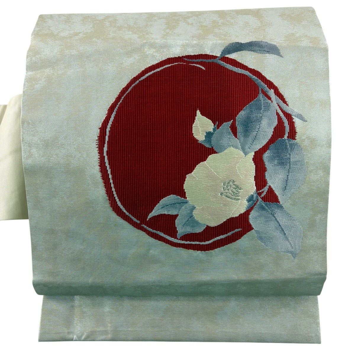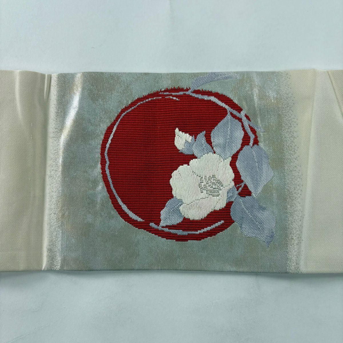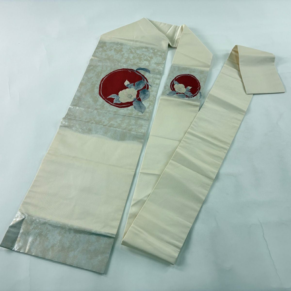 名古屋帯 優品 椿 刺繍 銀糸 ベージュ 正絹