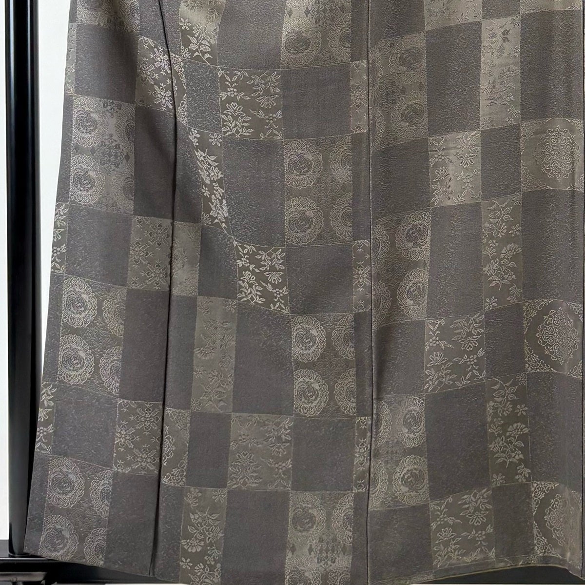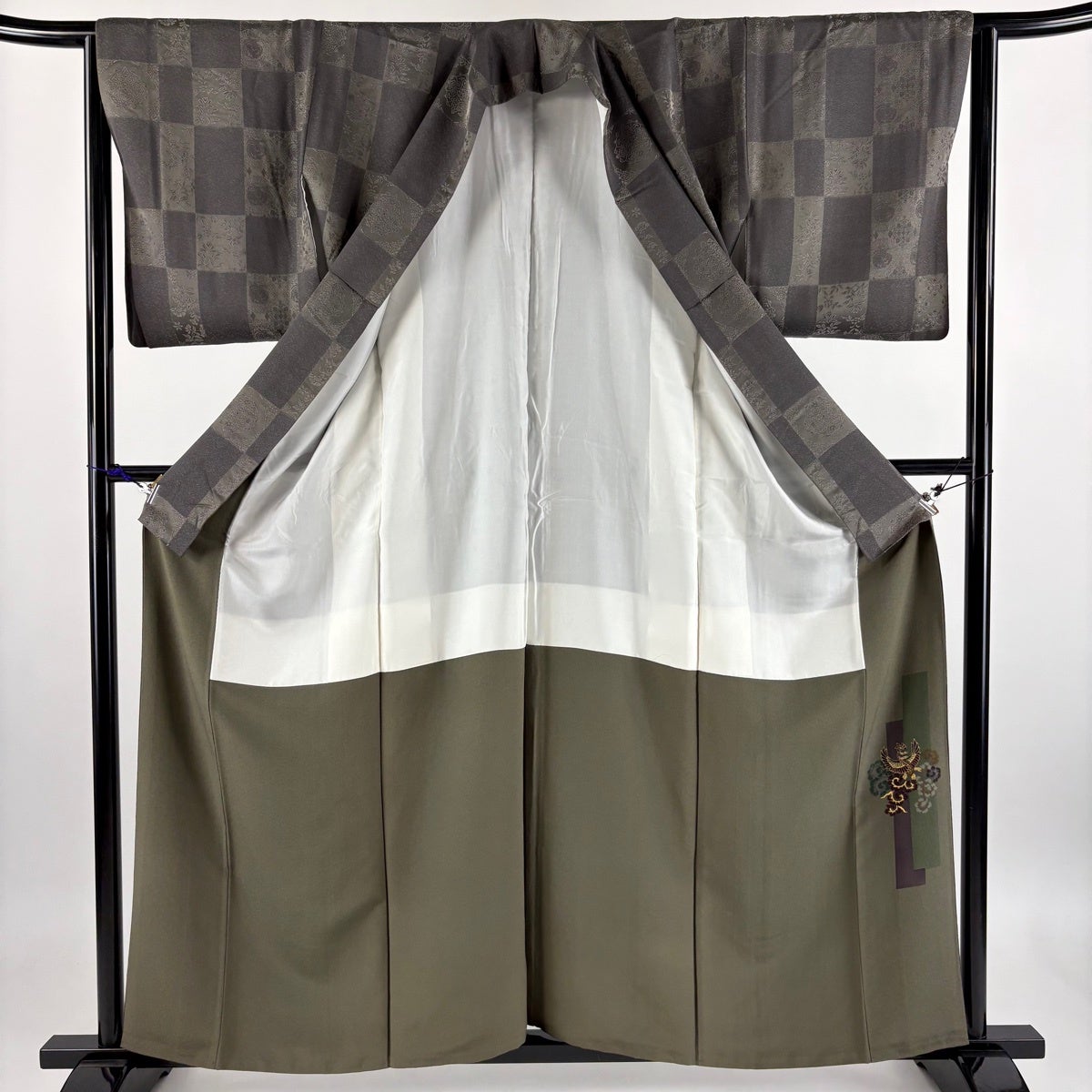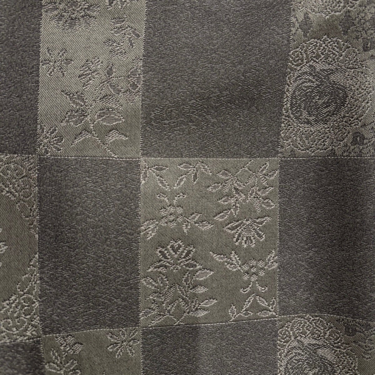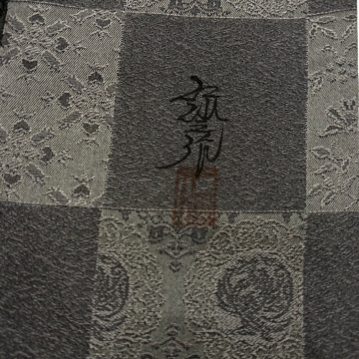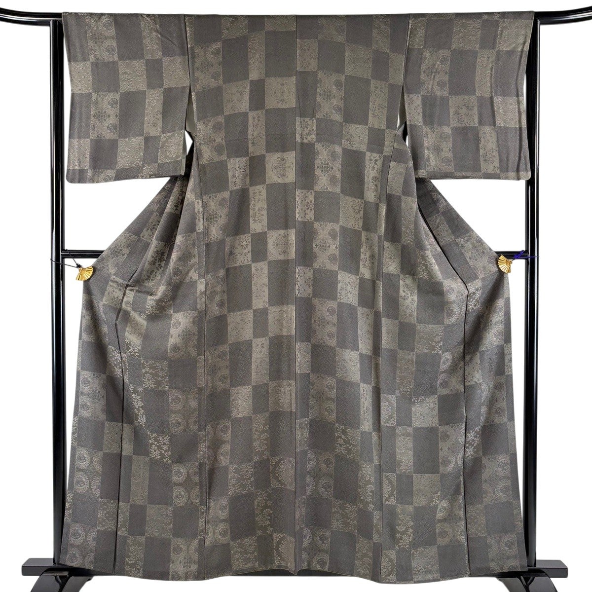 小紋 身丈160cm 裄丈64cm M 袷 前田仁仙 落款あり 市松 草花 灰緑 正絹 逸品