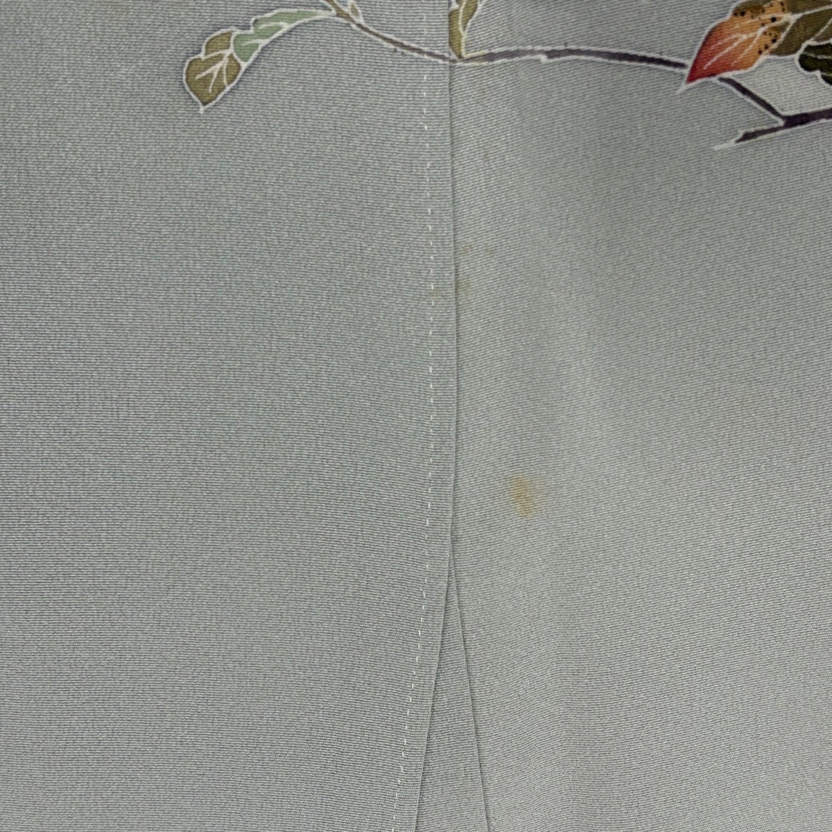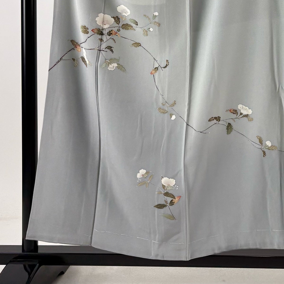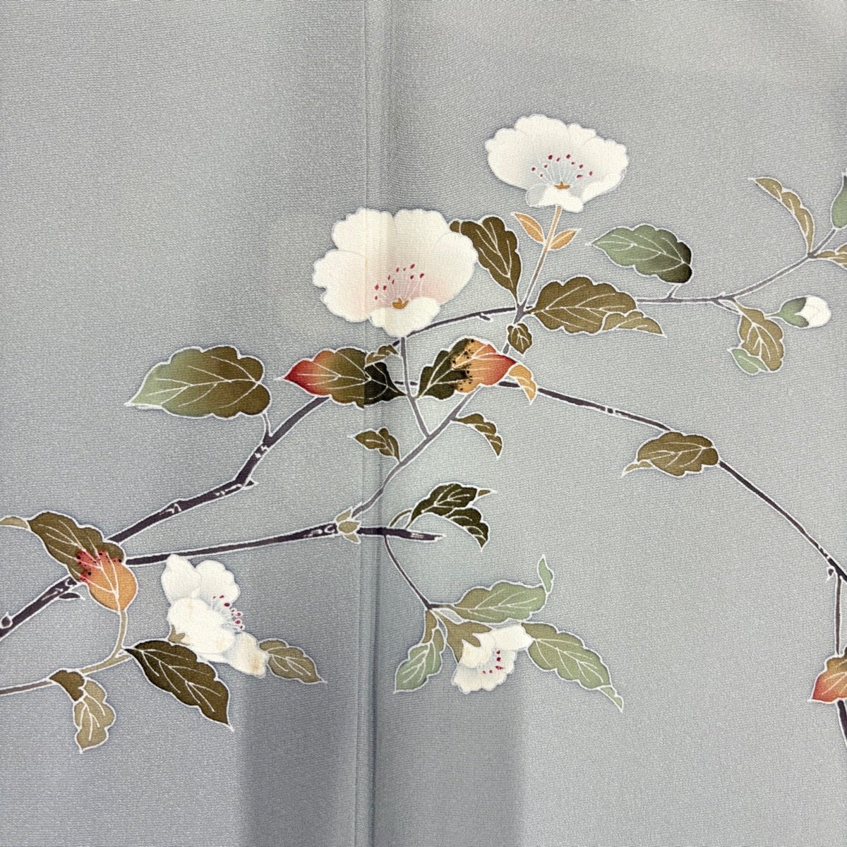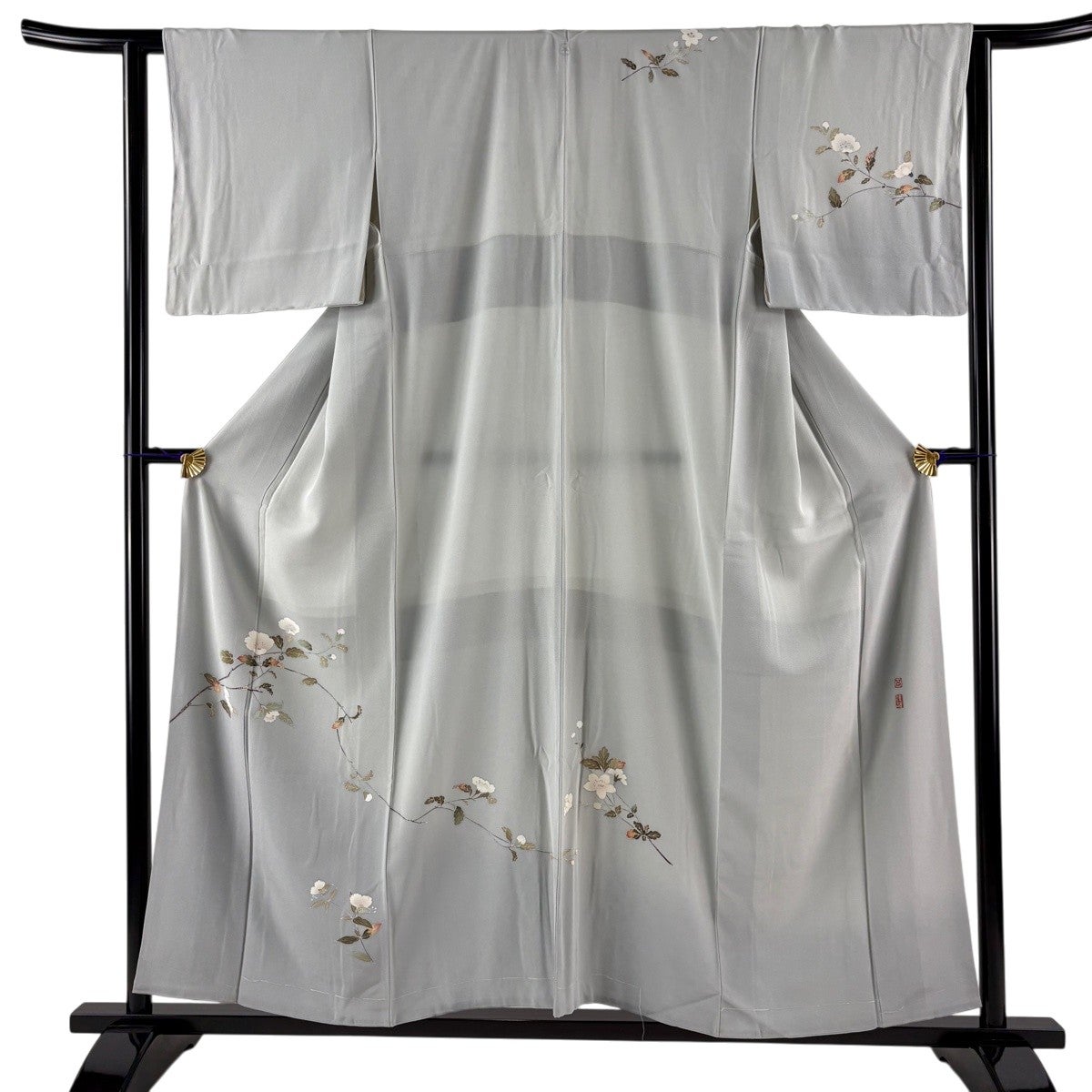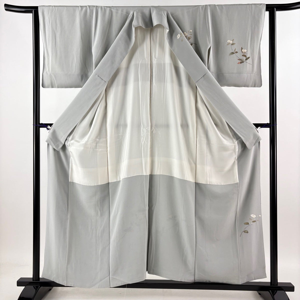訪問着 身丈158.5cm 裄丈62cm S 袷 百貫達雄 落款あり 枝花 ぼかし 灰色 正絹 名品 一つ紋