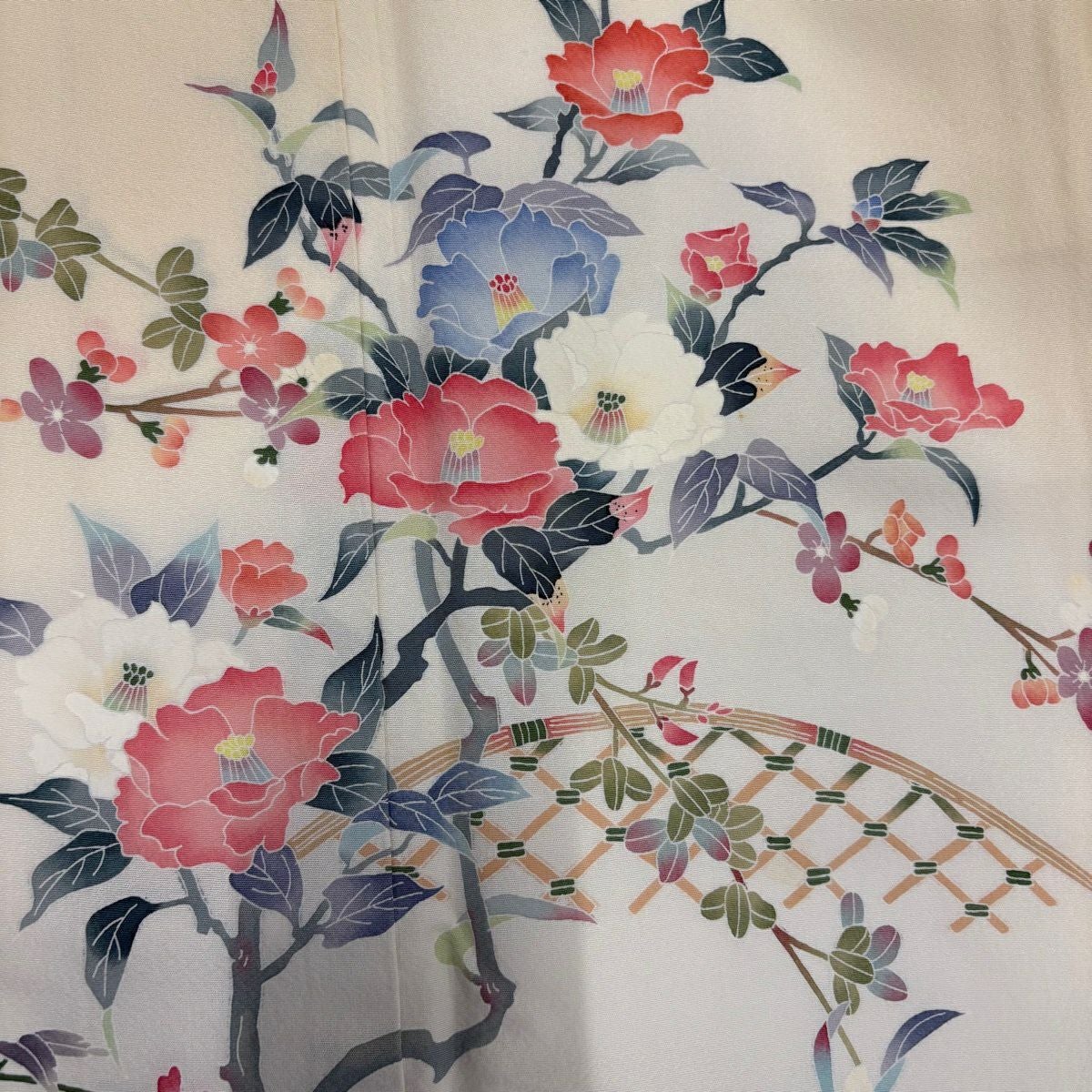 訪問着 身丈159cm 裄丈64cm M 袷 百貫達雄 落款あり 花車 草花 ぼかし クリーム 正絹 秀品