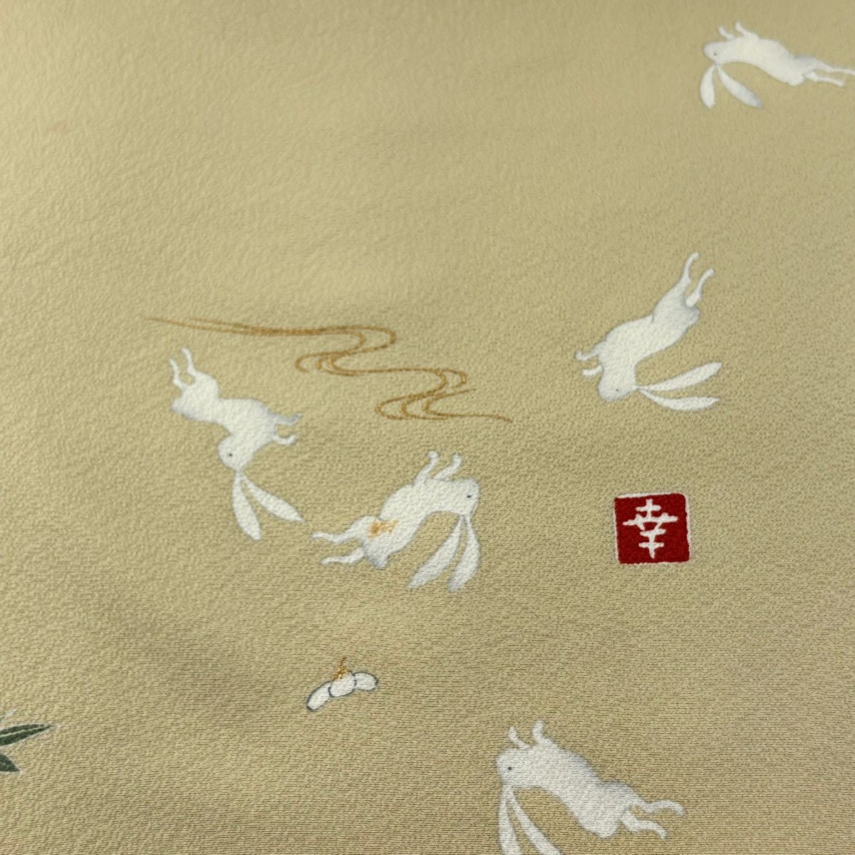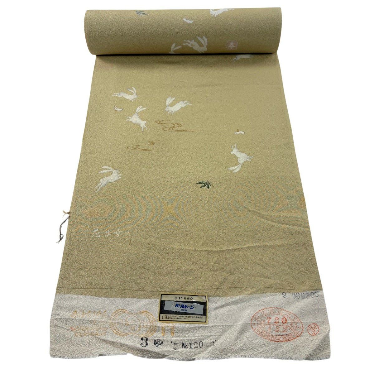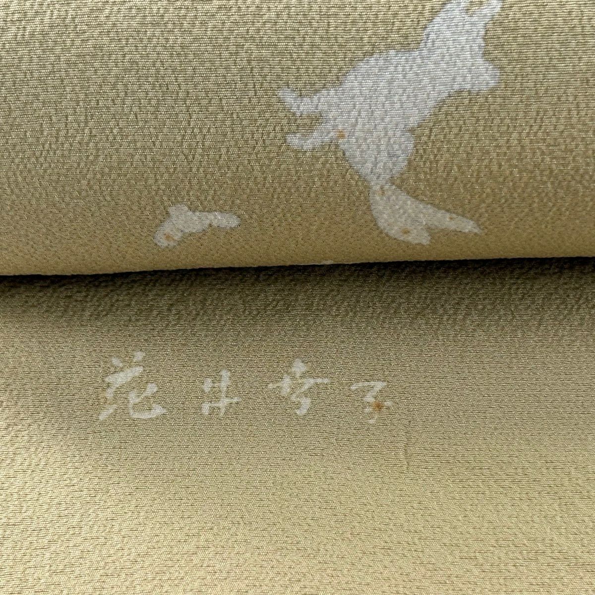 反物 名品 小紋 落款有り 花井幸子 うさぎ 葉柄 金彩 ベージュ 正絹