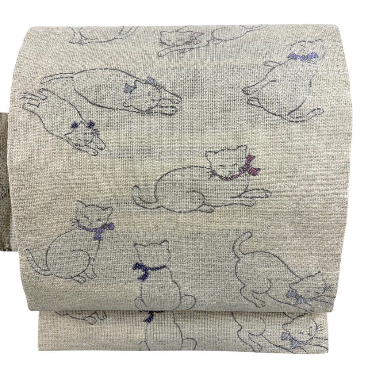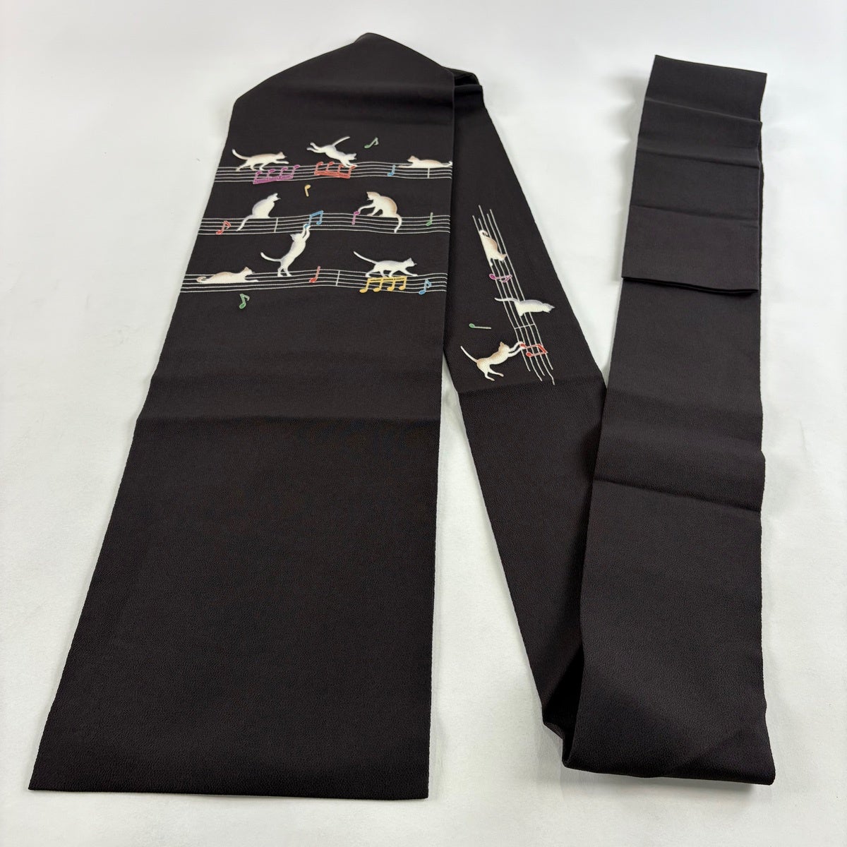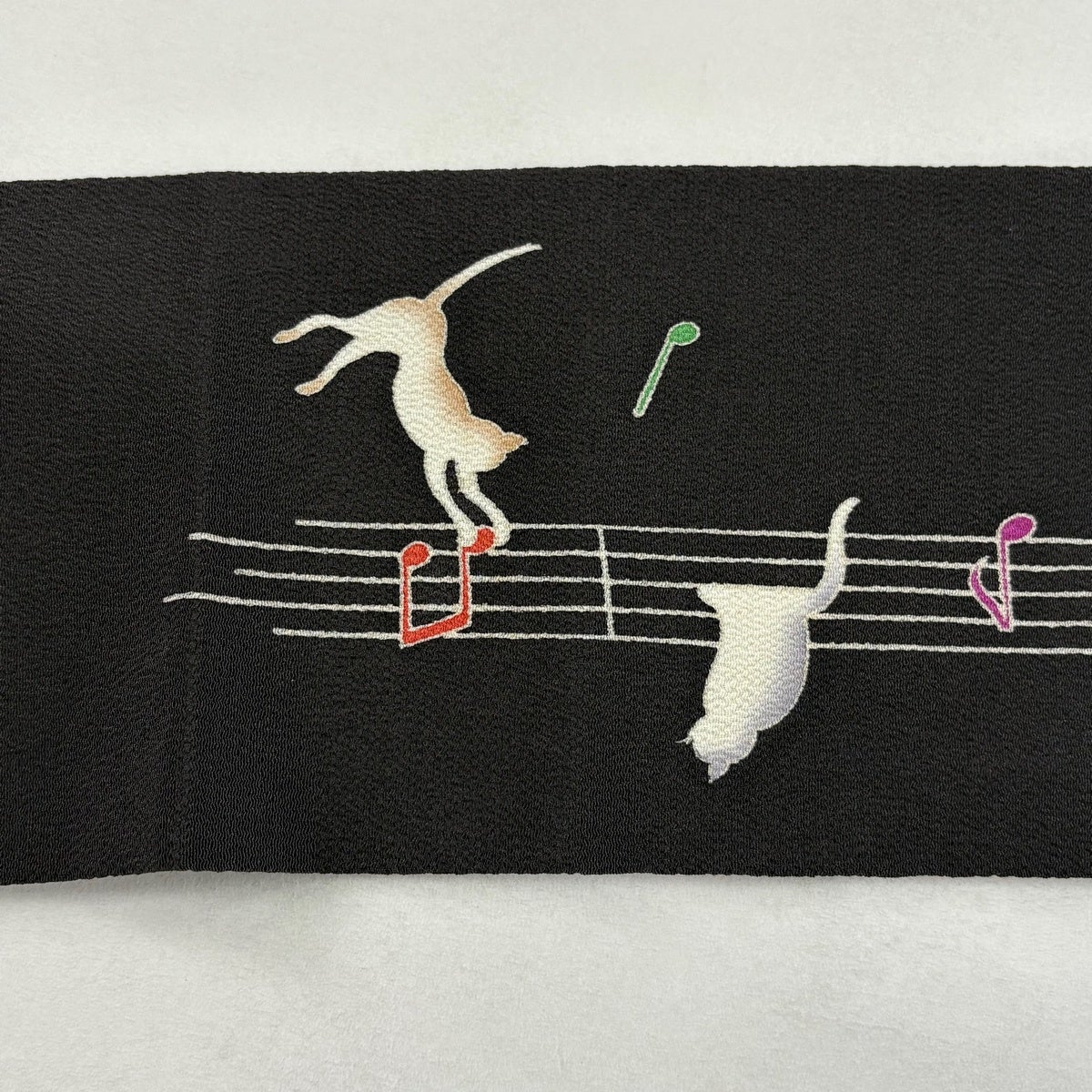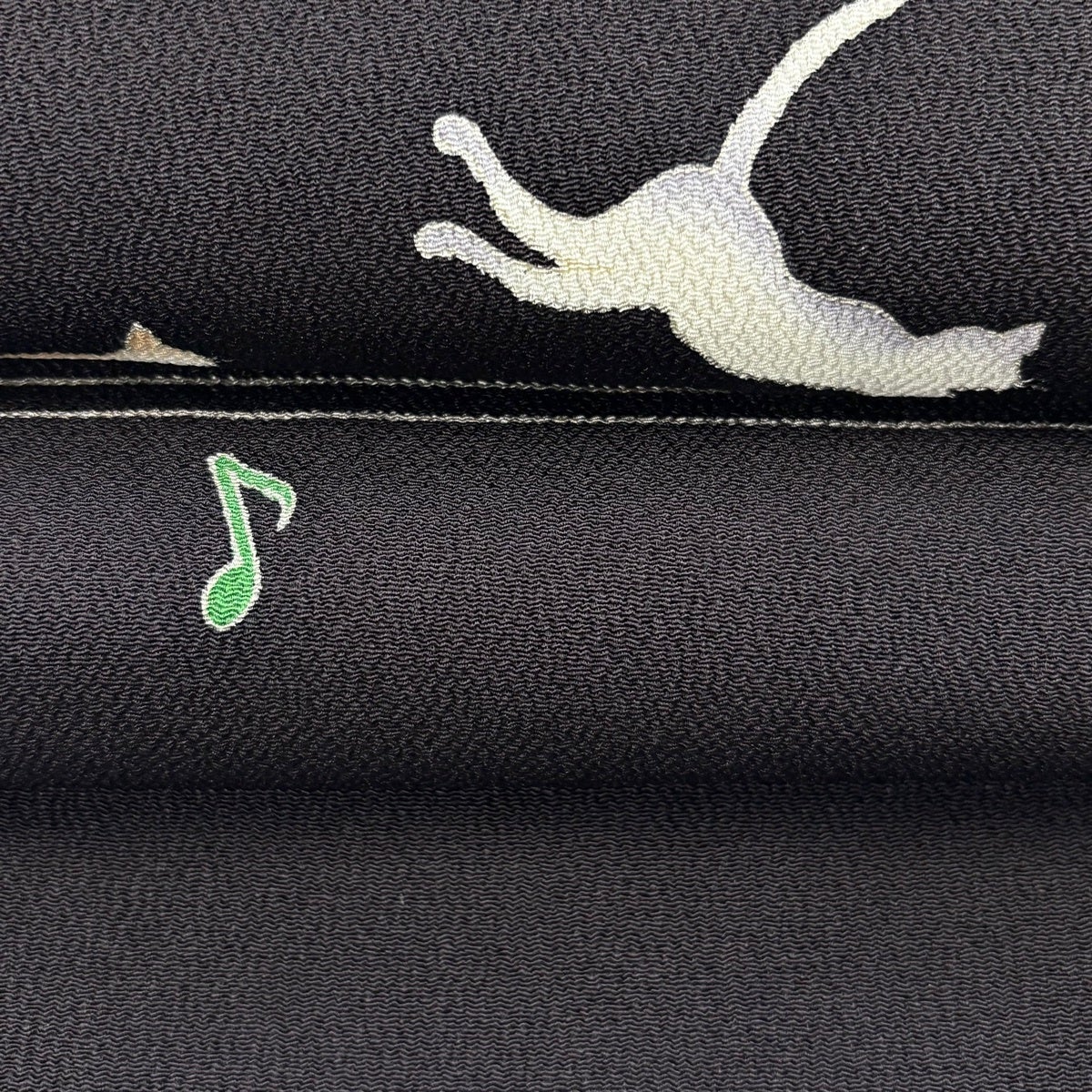 名古屋帯 逸品 猫 音符 縮緬 黒 正絹