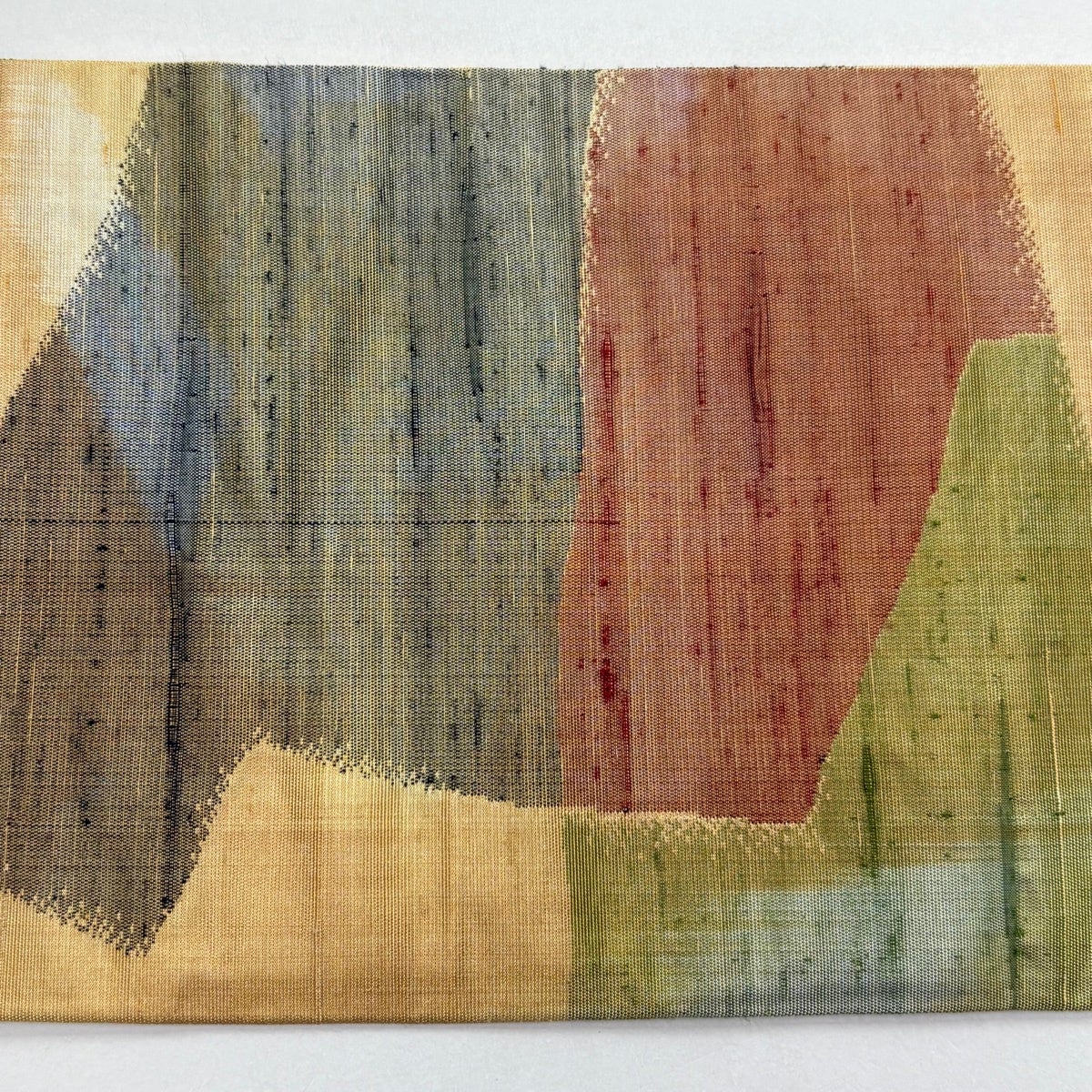【美品】 名古屋帯 名品 証紙あり 小千谷紬地 幾何学模様 絞り 灰緑 正絹