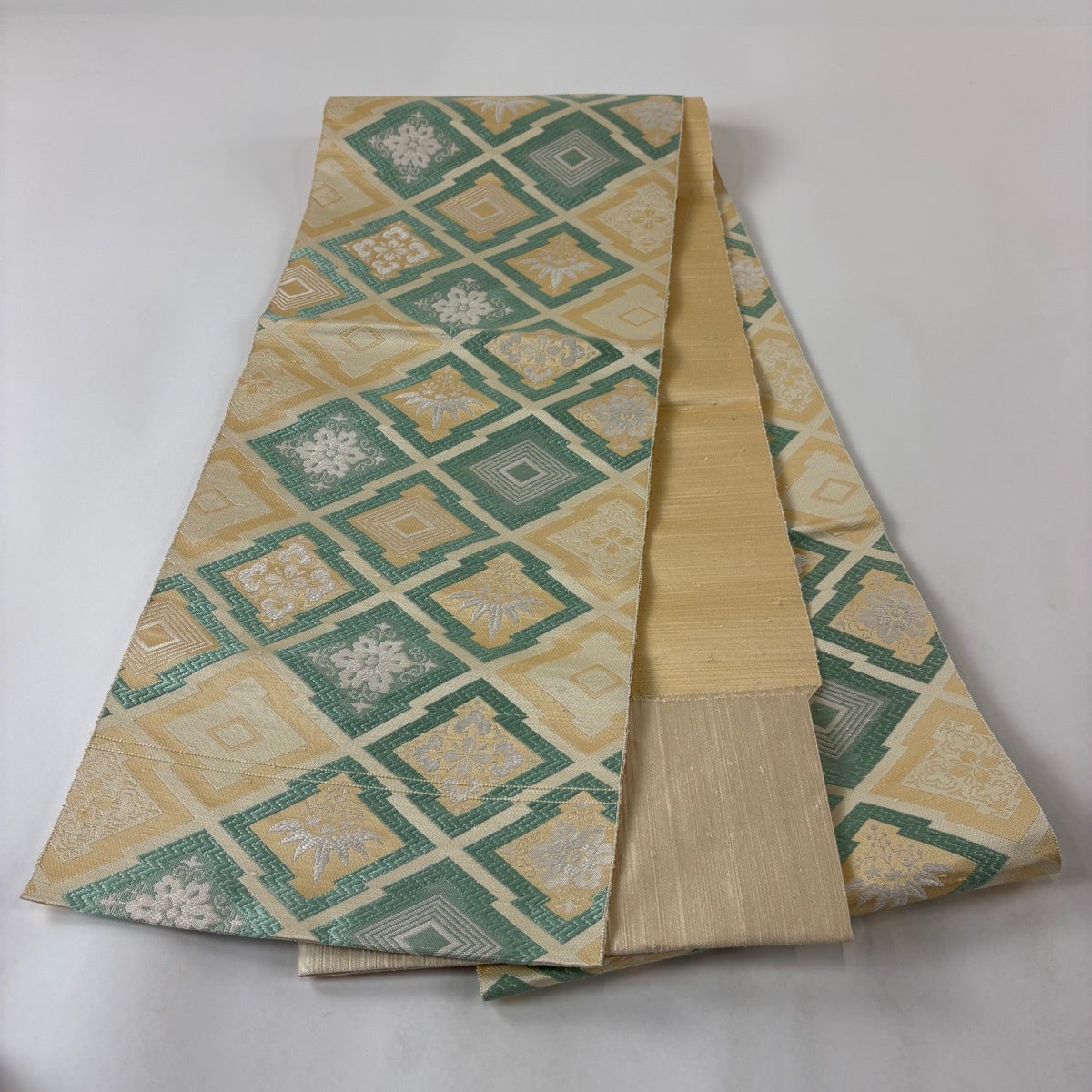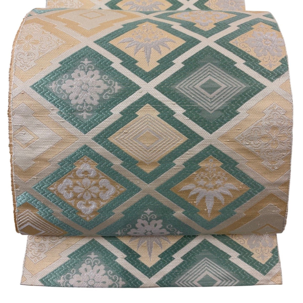 【美品】 名古屋帯 秀品 八寸名古屋帯 松葉仕立て 菱 段縞 金糸 クリーム 正絹