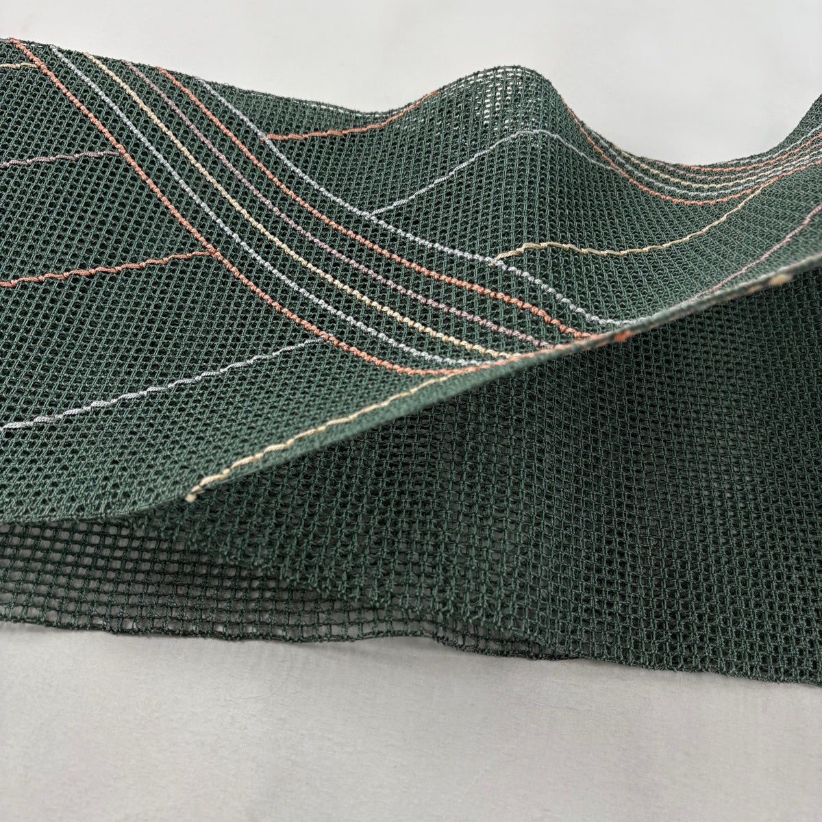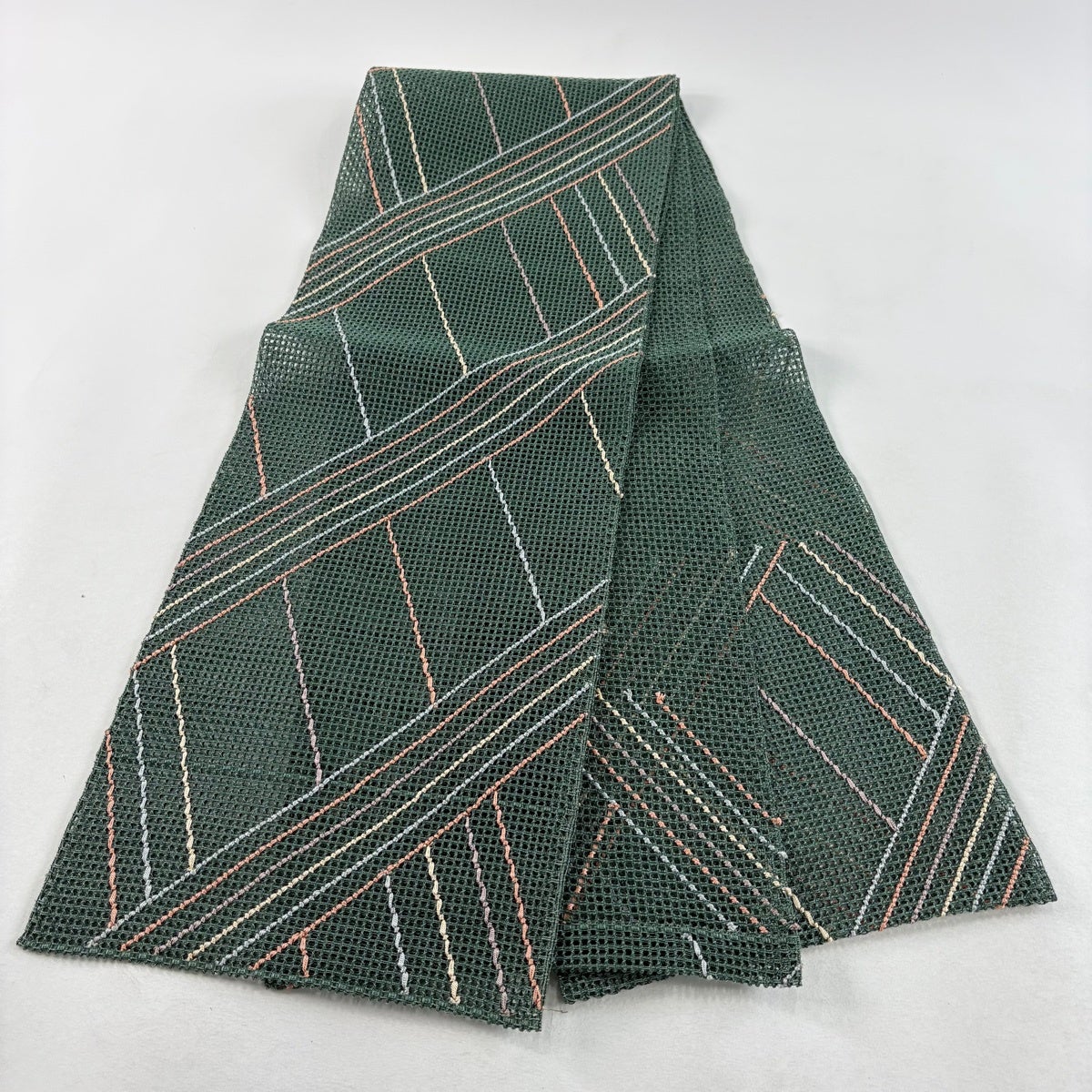 【美品】 名古屋帯 秀品 夏帯 八寸名古屋帯 トンネル仕立て 縞 幾何学模様 灰緑 正絹