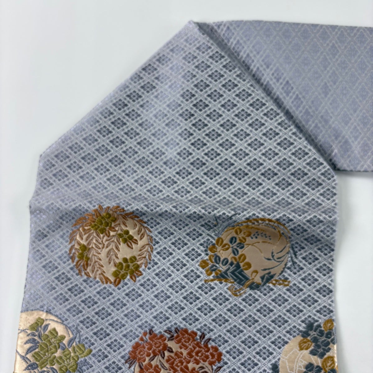名古屋帯 秀品 夏帯 八寸名古屋帯 幾何学 青灰色 正絹