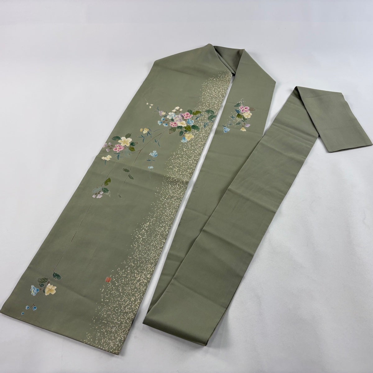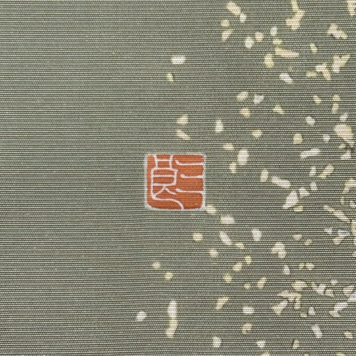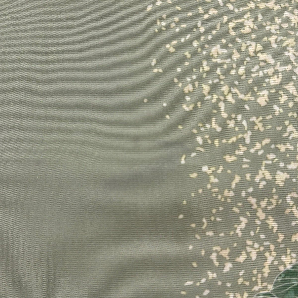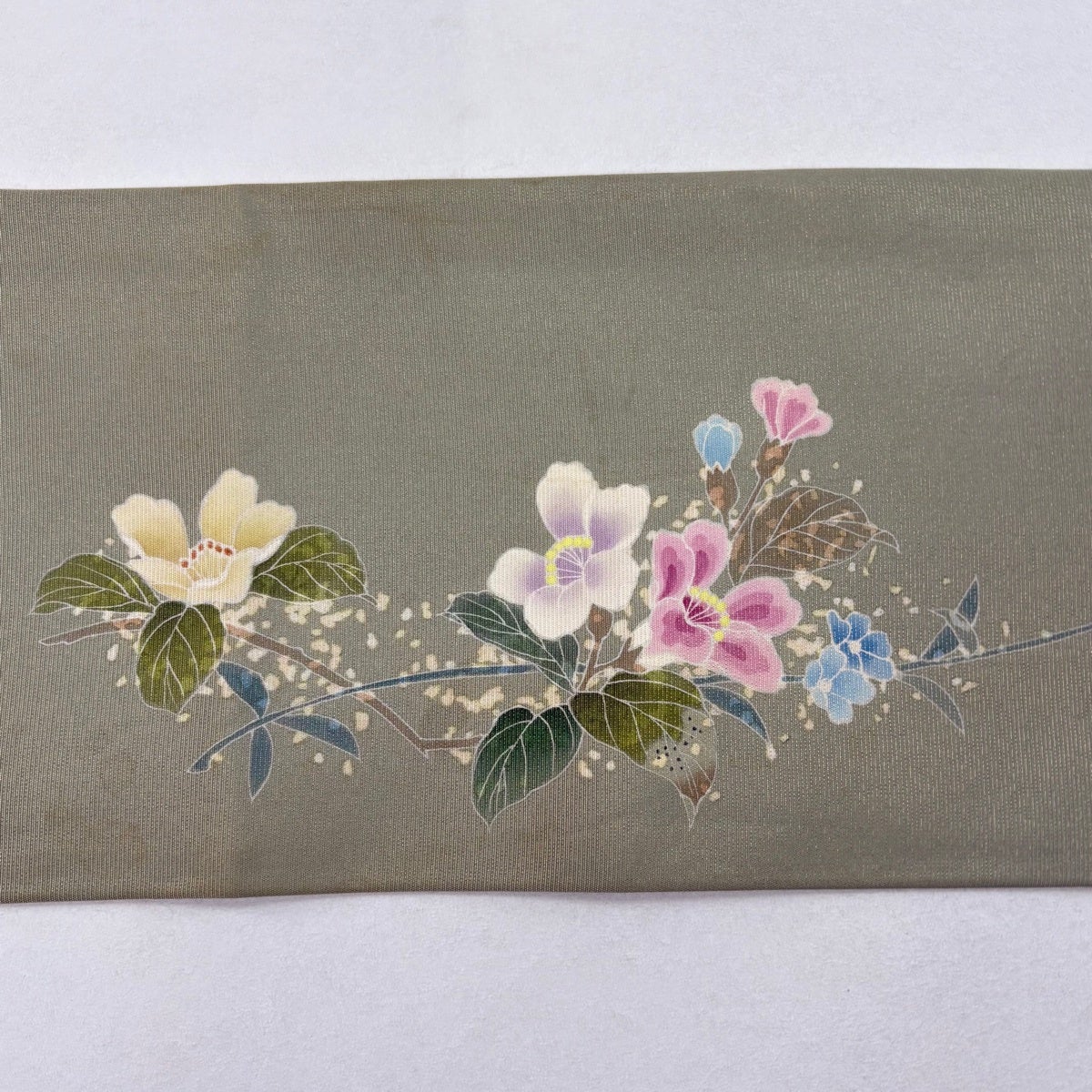 名古屋帯 秀品 落款あり 枝花 金通し 灰緑 正絹