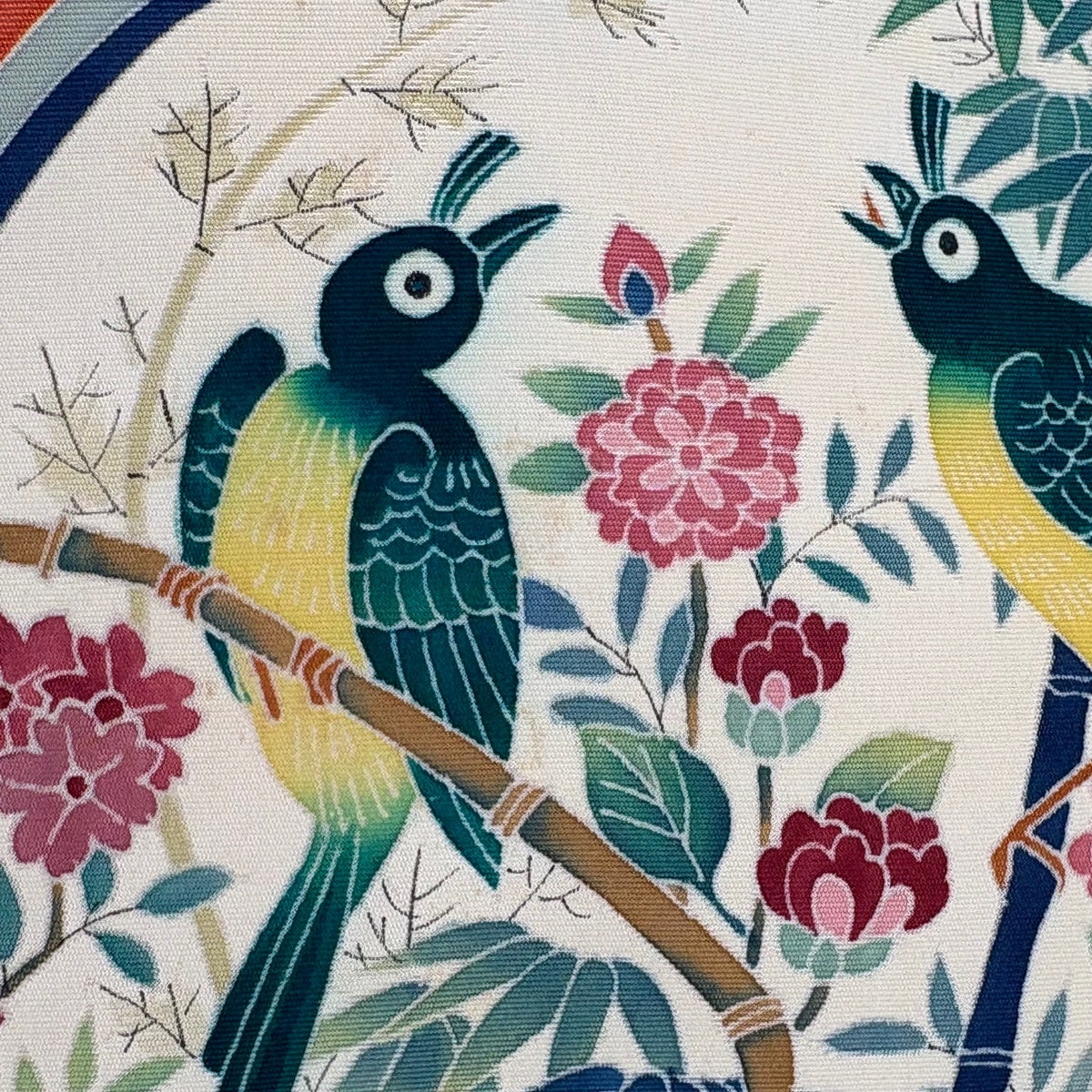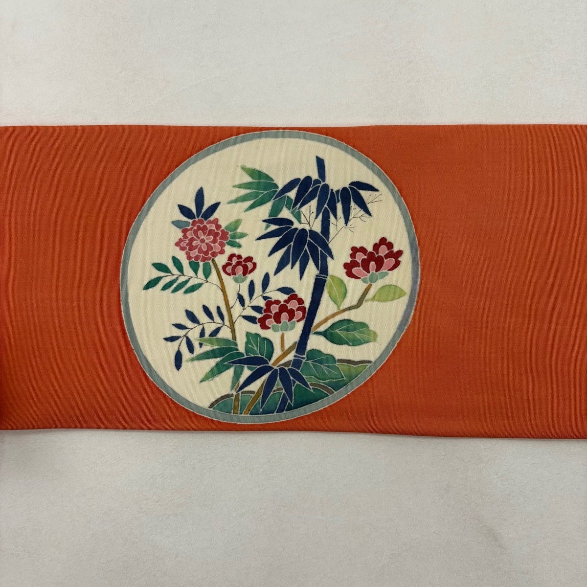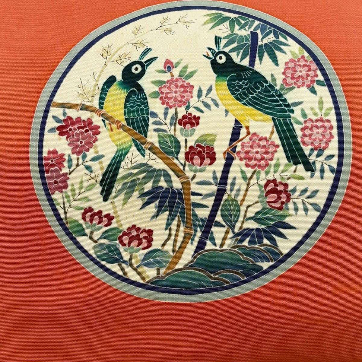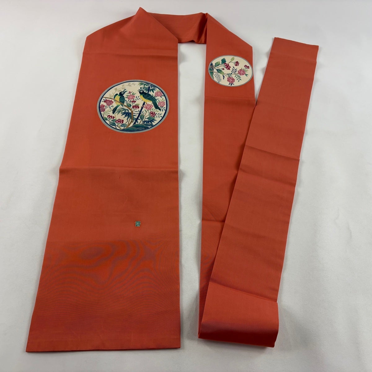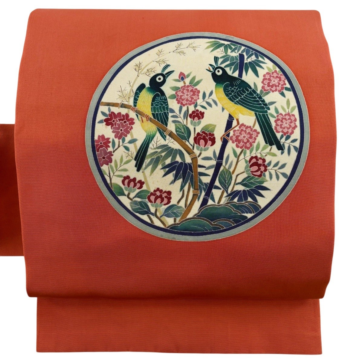 名古屋帯 優品 落款あり 丸紋 花鳥 オレンジ 正絹