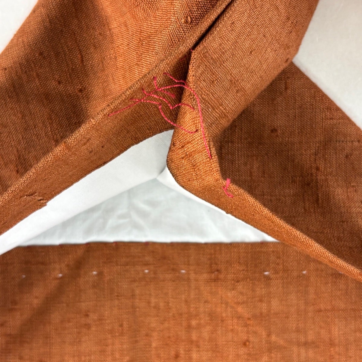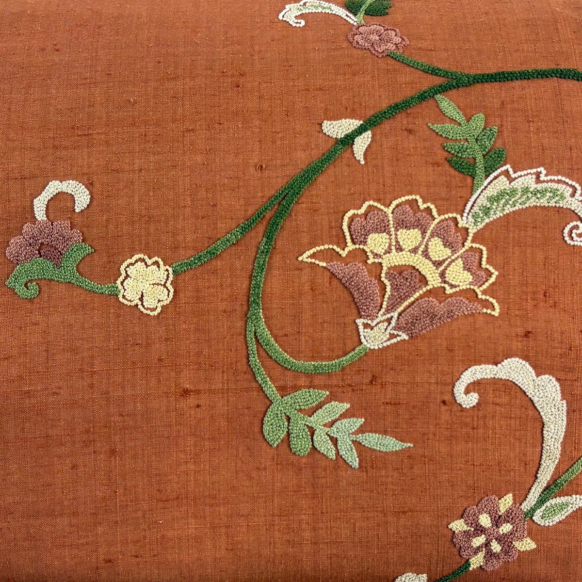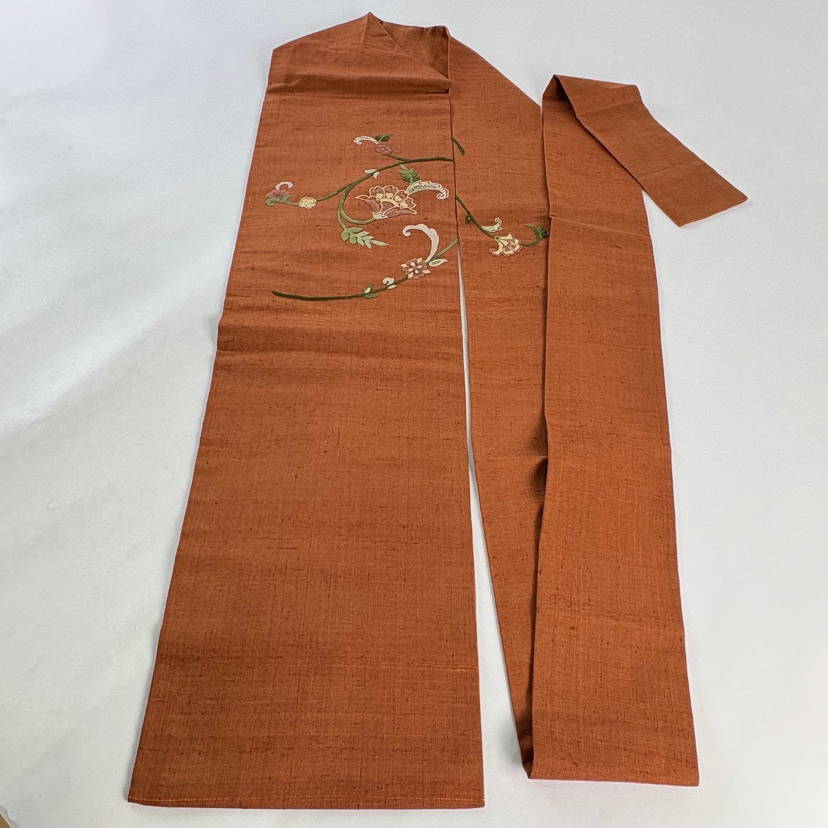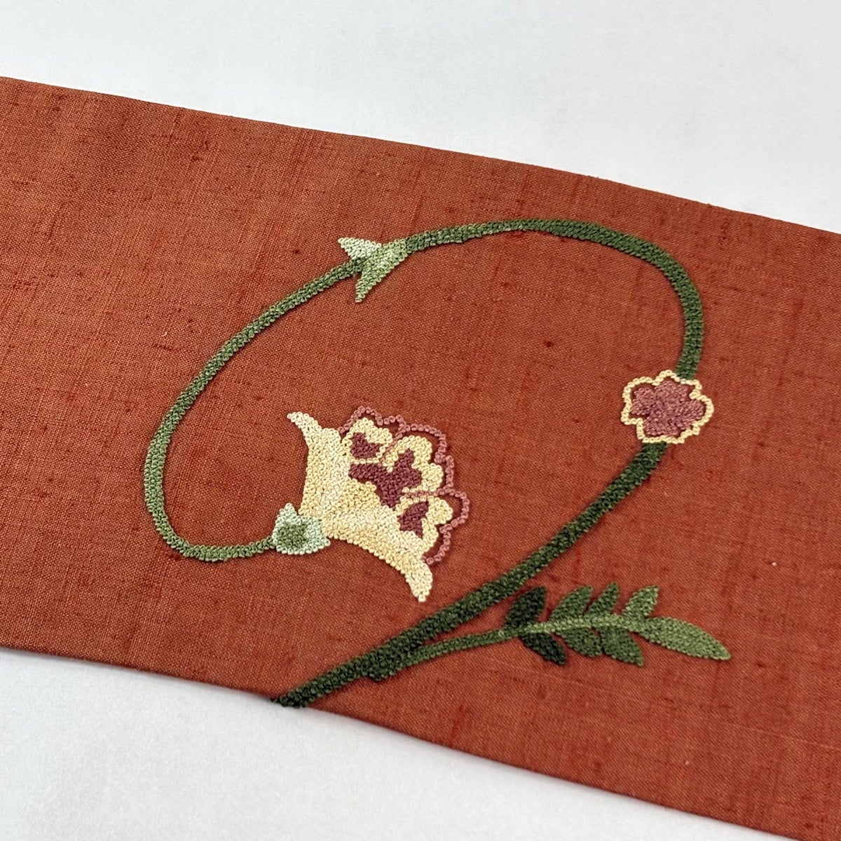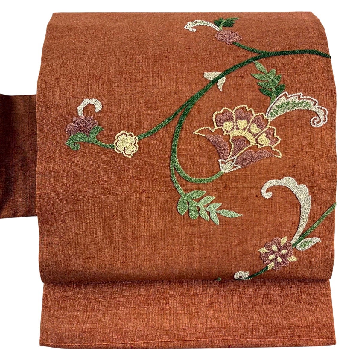 【美品】 名古屋帯 秀品 紬地 華文 刺繍 赤茶 正絹