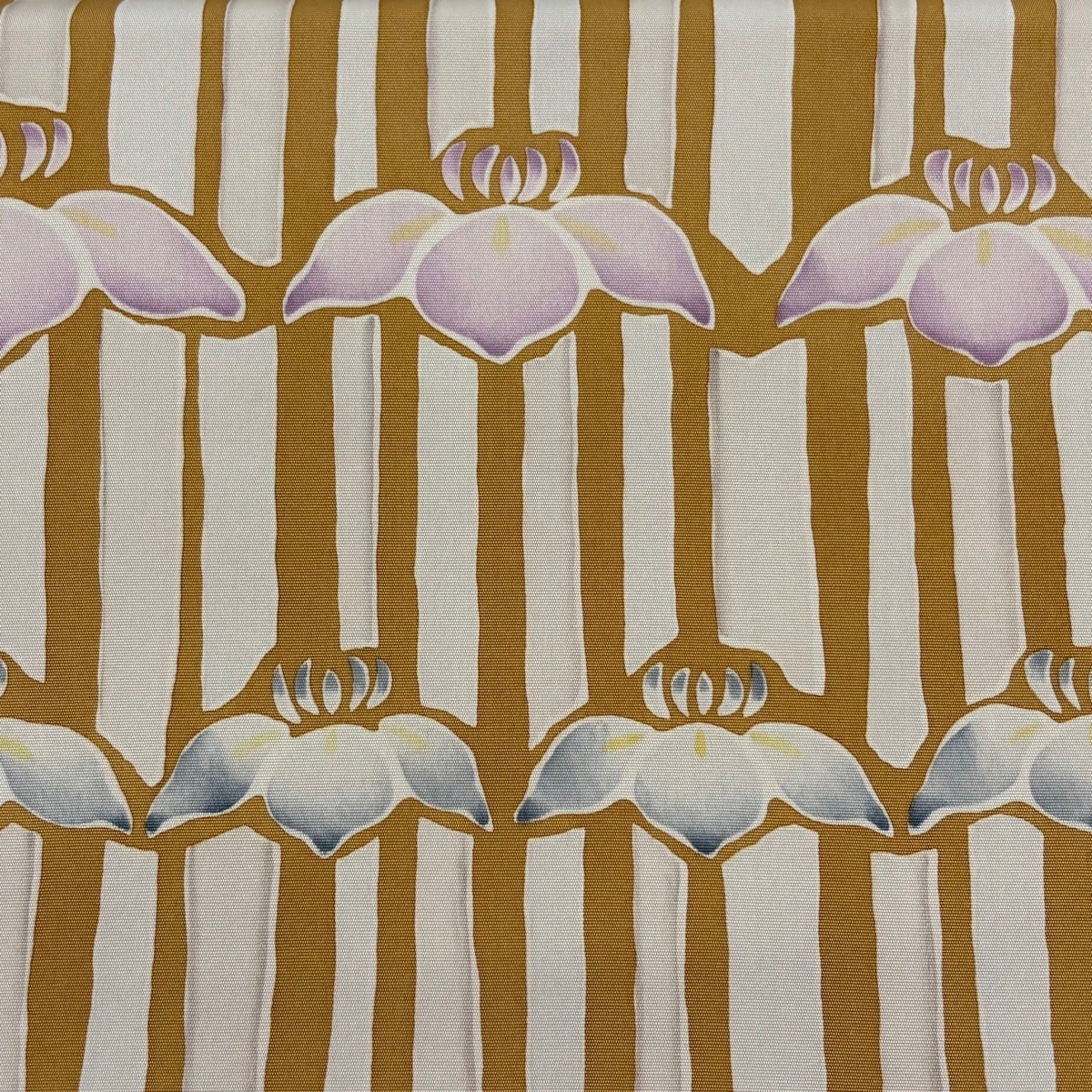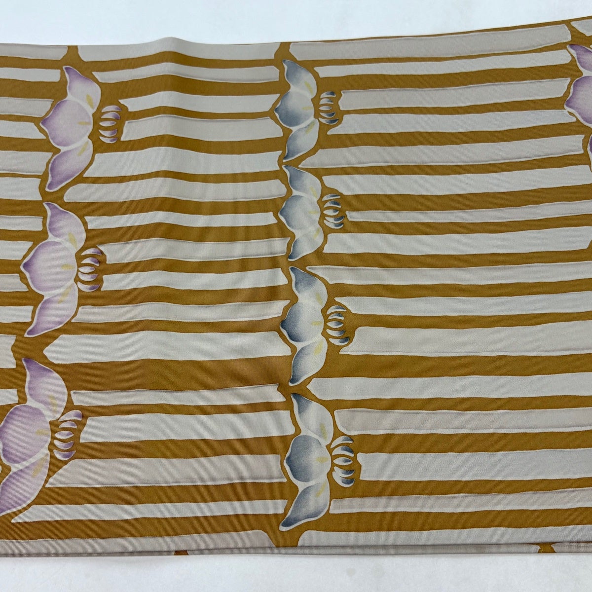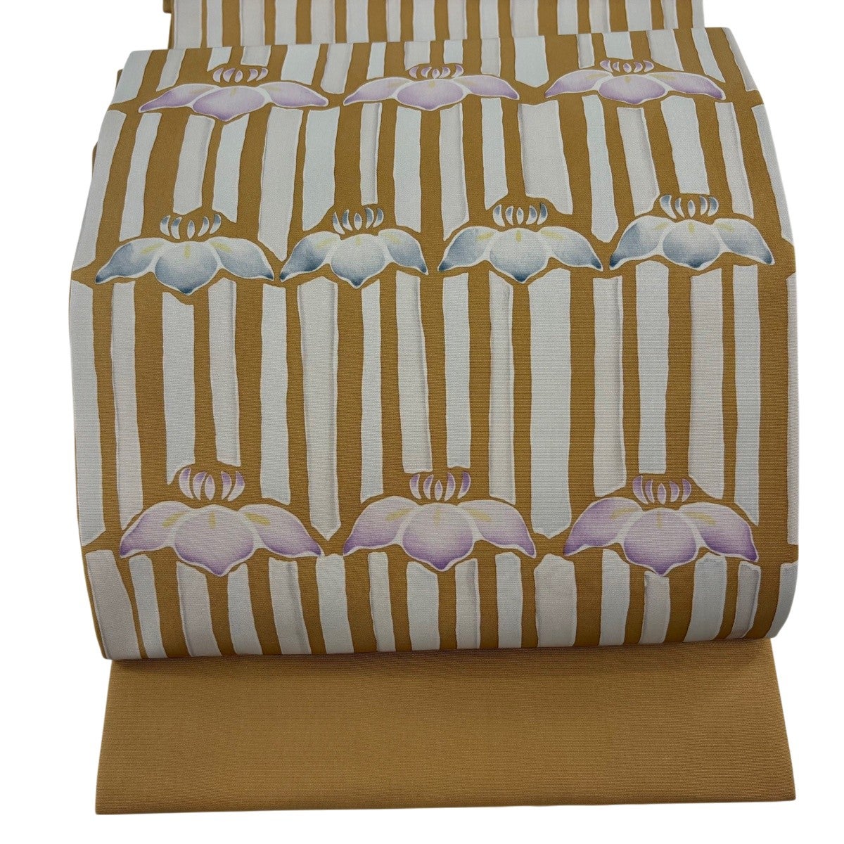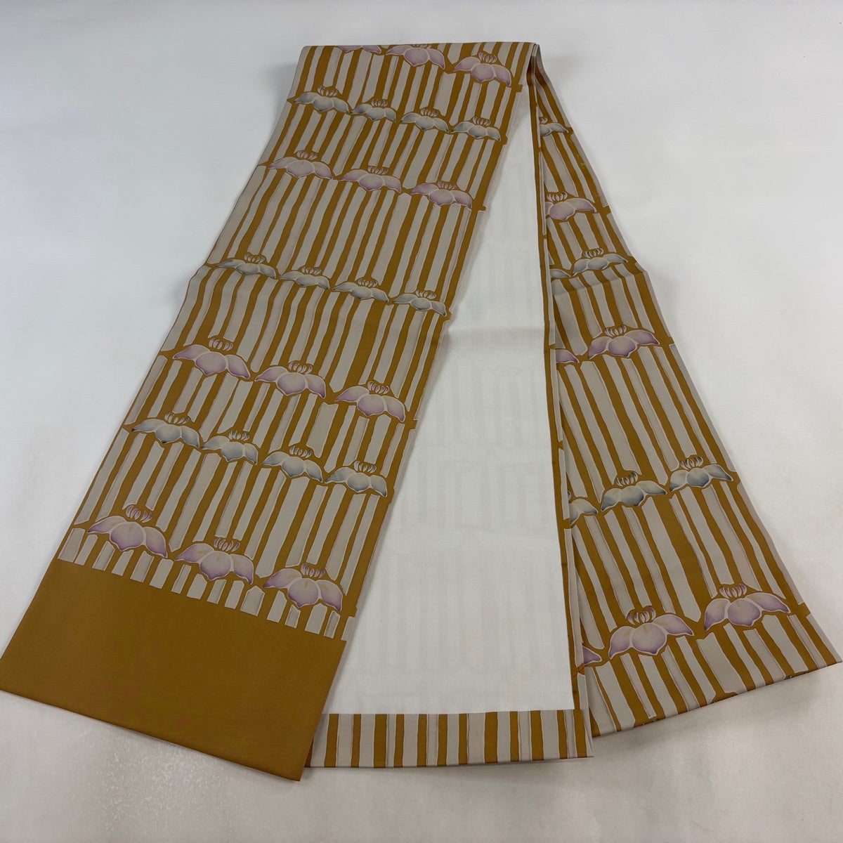 【美品】 開き名古屋帯 秀品 花 縞 黄土色 正絹