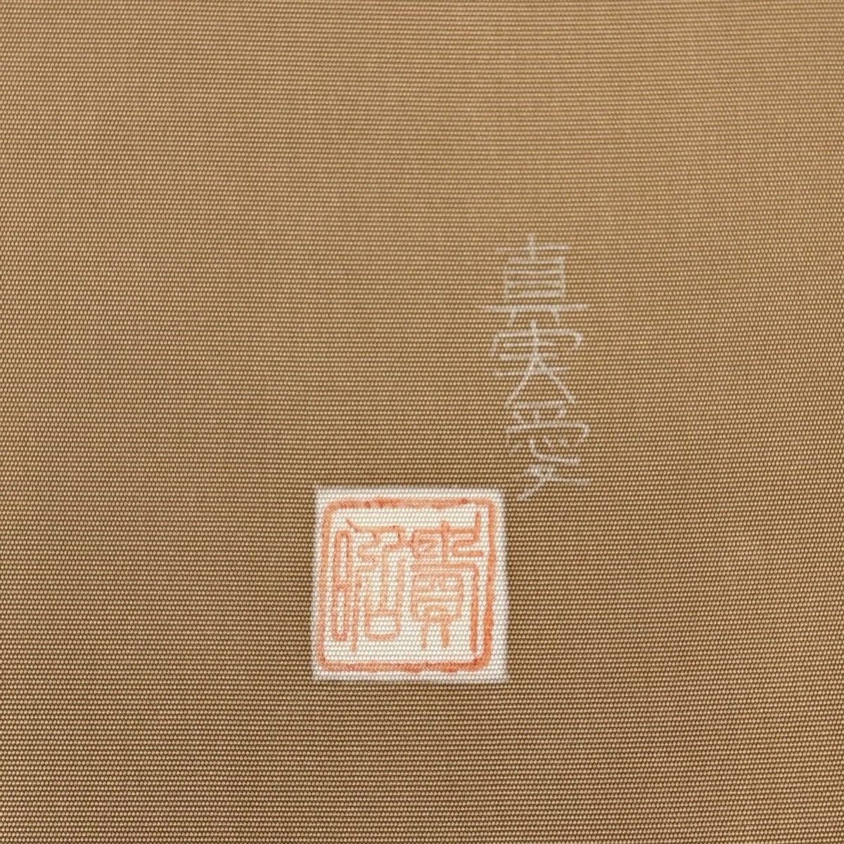 名古屋帯 秀品 落款あり 伊達 静 関西仕立て 八寸名古屋帯 松葉仕立て 樹木 幾何学模様 金糸 抹茶色 正絹
