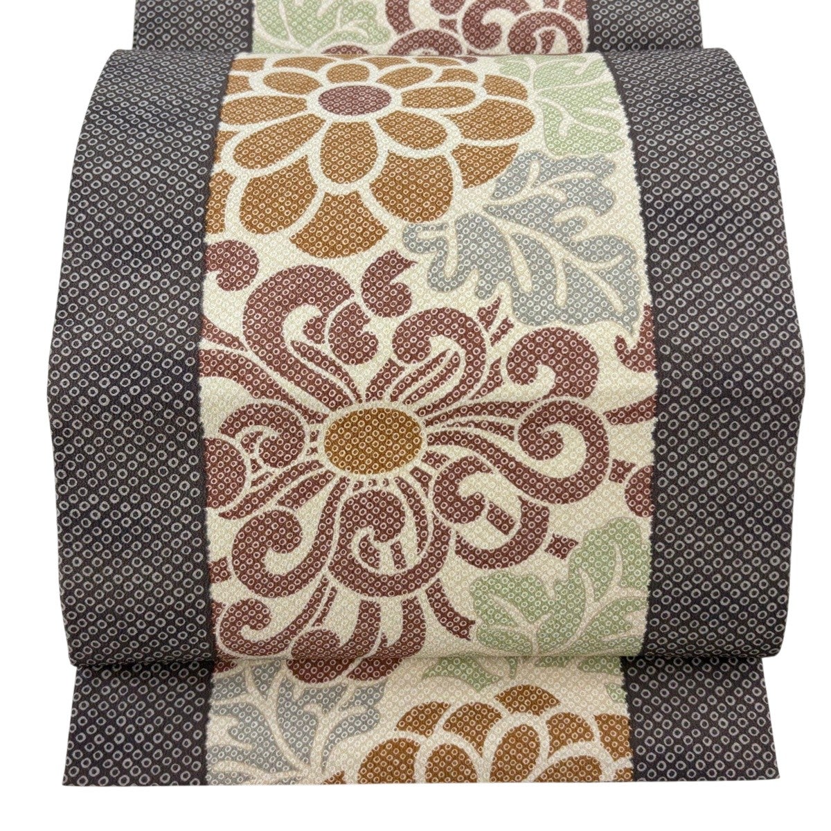 【美品】 開き名古屋帯 秀品 紬地 葡萄 刺繍 茶色 正絹