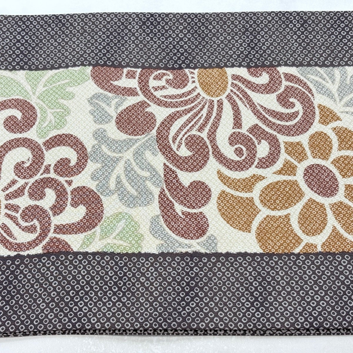 【美品】 袋名古屋帯 秀品 花唐草 箔 ベージュ 化繊