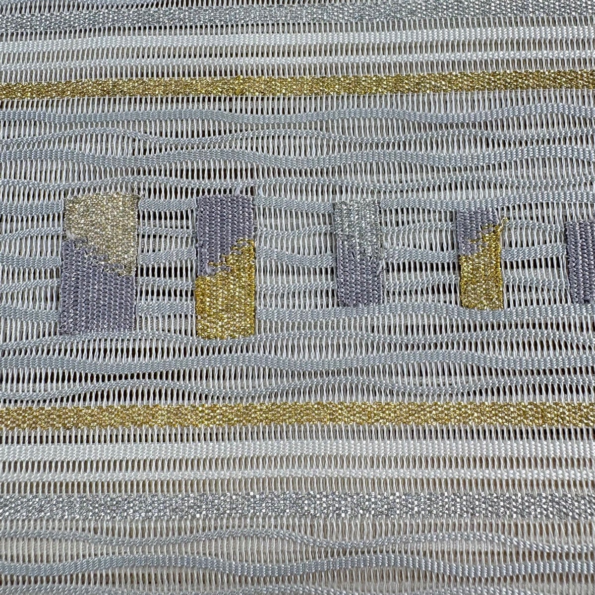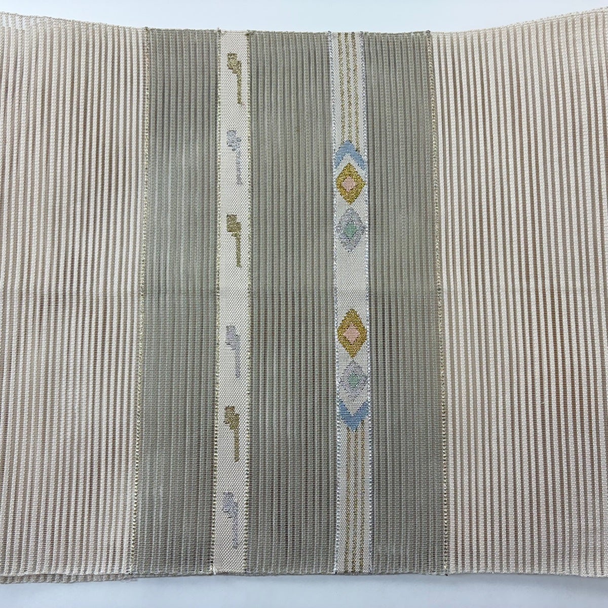 名古屋帯 秀品 夏帯 八寸名古屋帯 紬地 松葉仕立て トンネル仕立て 幾何学模様 横段 金銀糸 ベージュ 正絹
