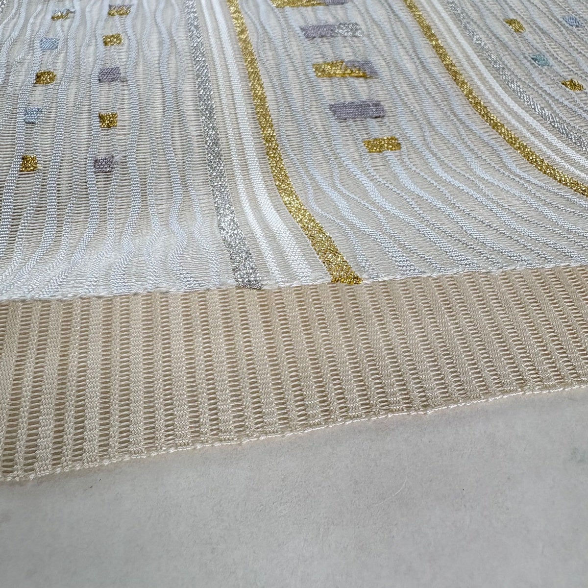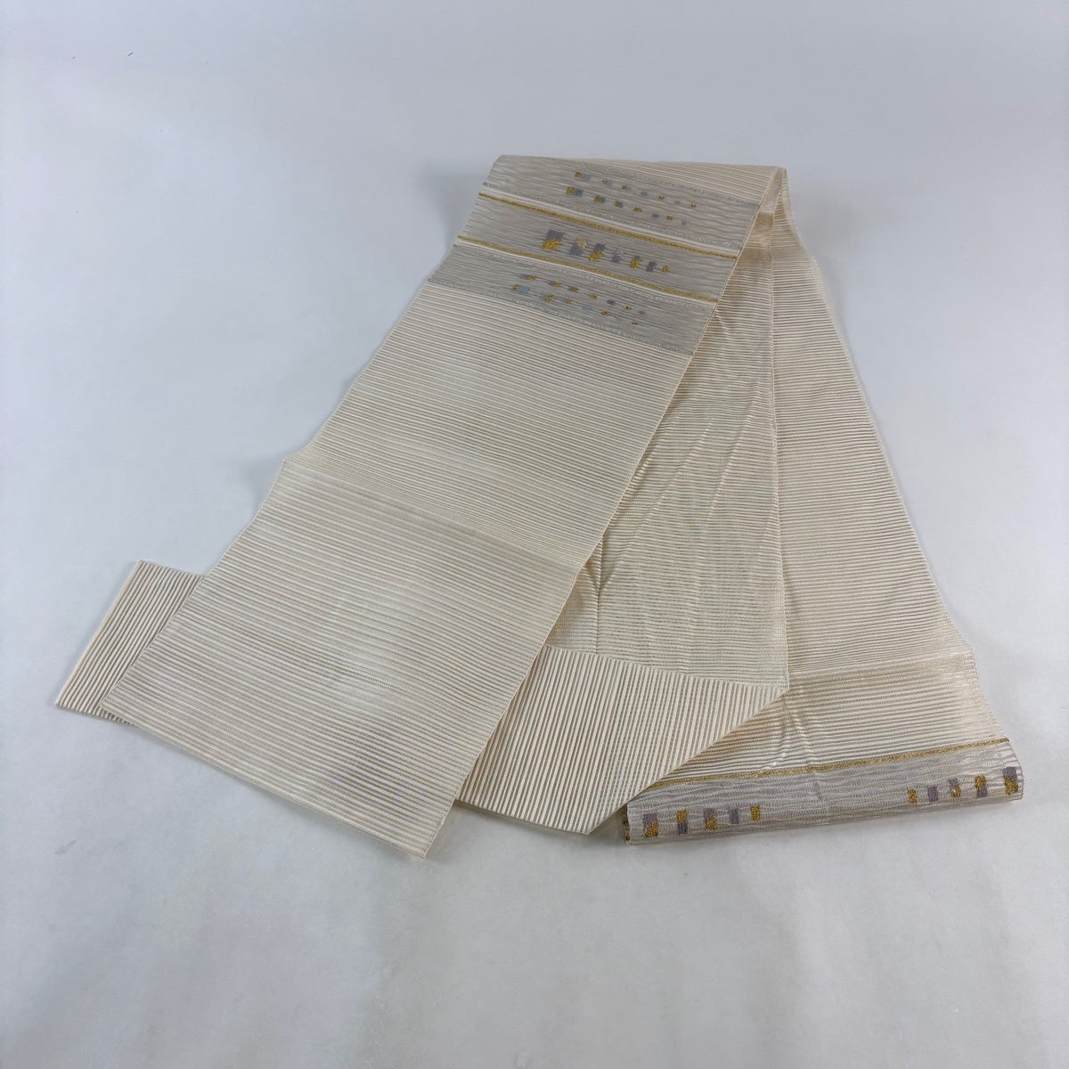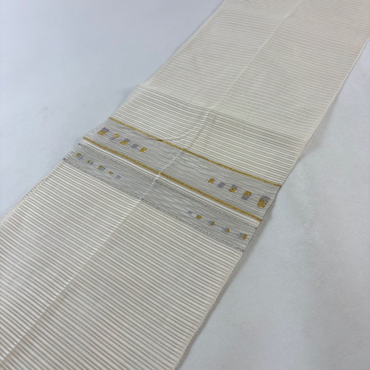 【美品】 名古屋帯 秀品 夏帯 絽 八寸名古屋帯 松葉仕立て トンネル仕立て 段縞 幾何学 金銀糸 クリーム 正絹