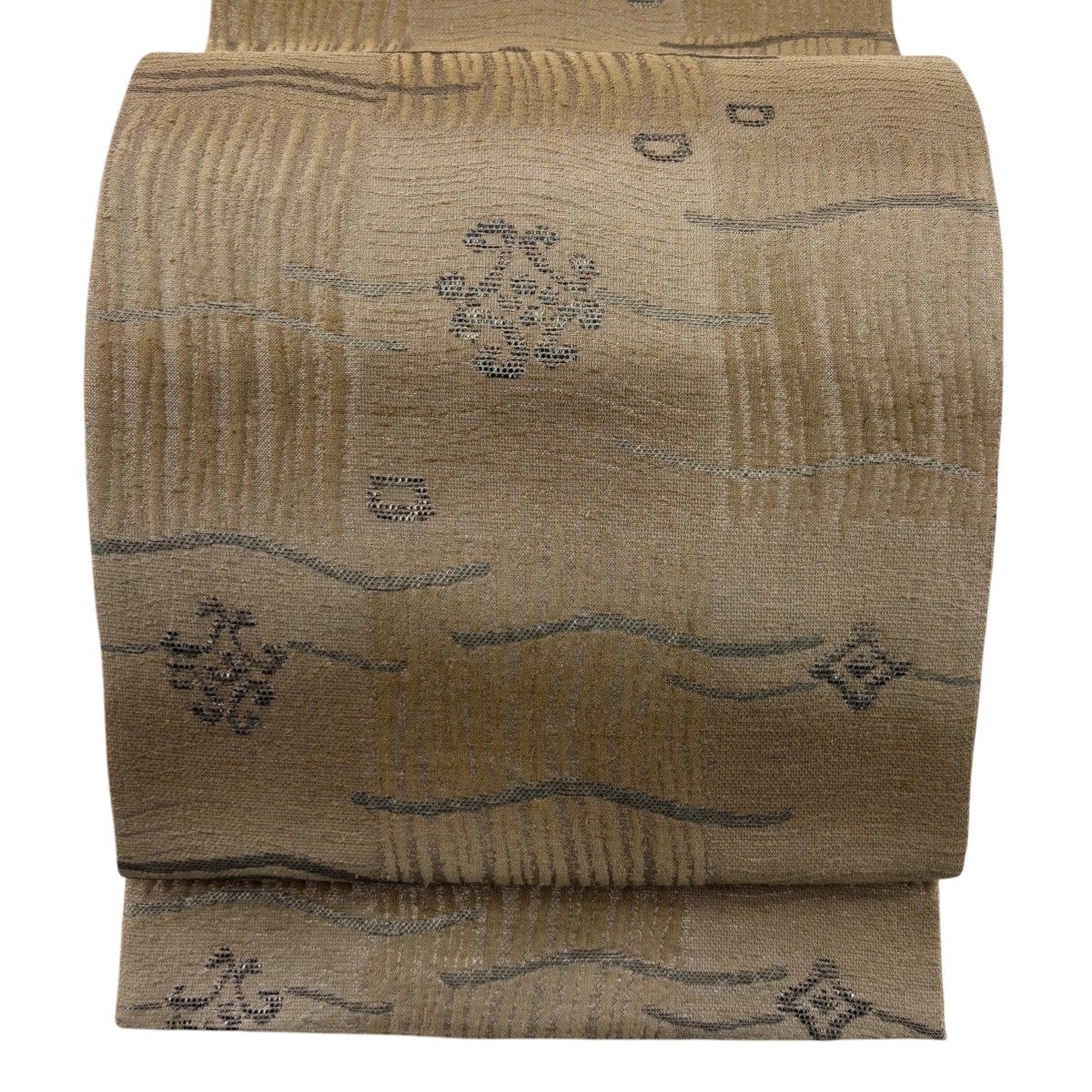 【美品】 袋帯 名品 幾何学 金銀糸 薄茶色 全通 正絹