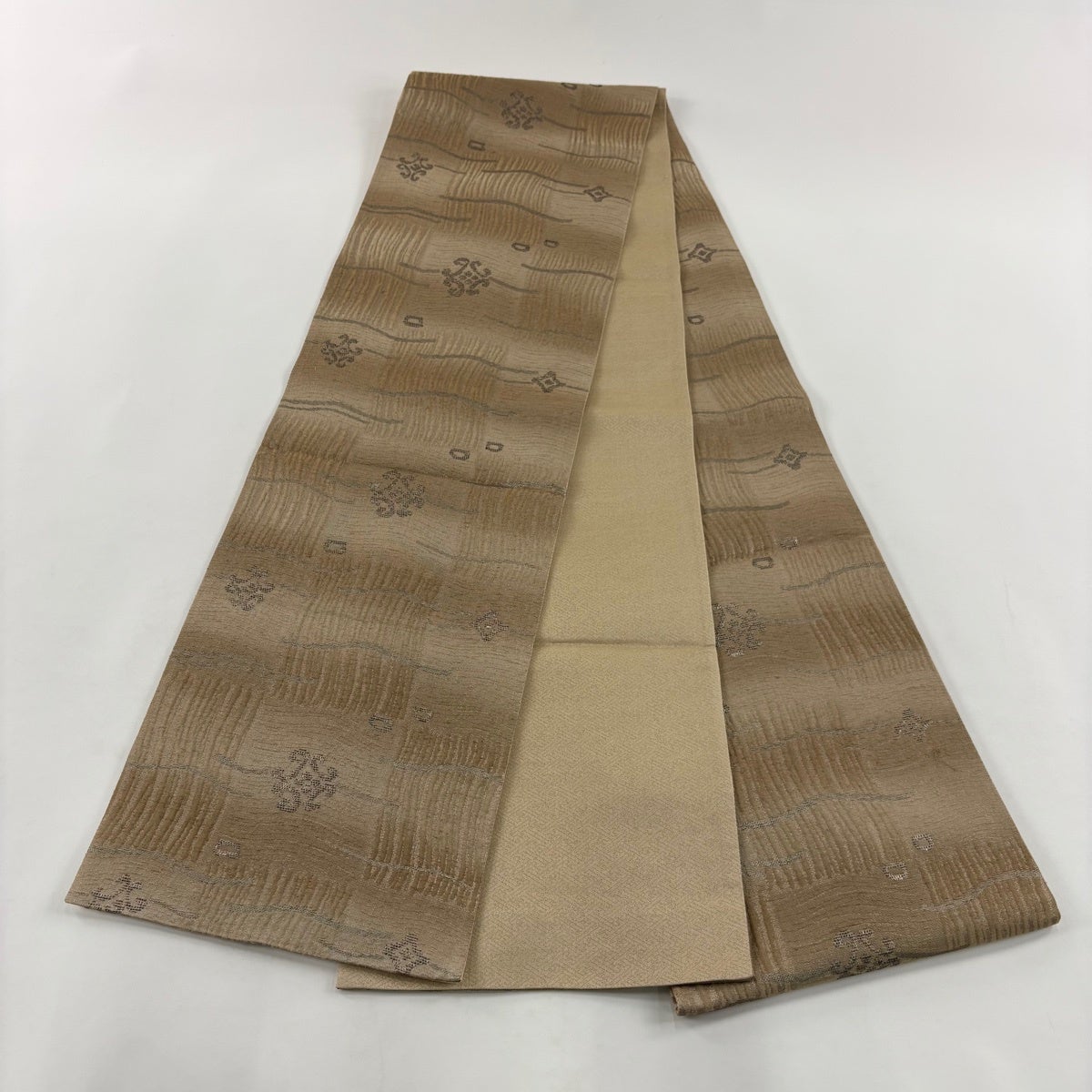 【美品】 袋帯 名品 幾何学模様 箔 薄茶色 全通 正絹