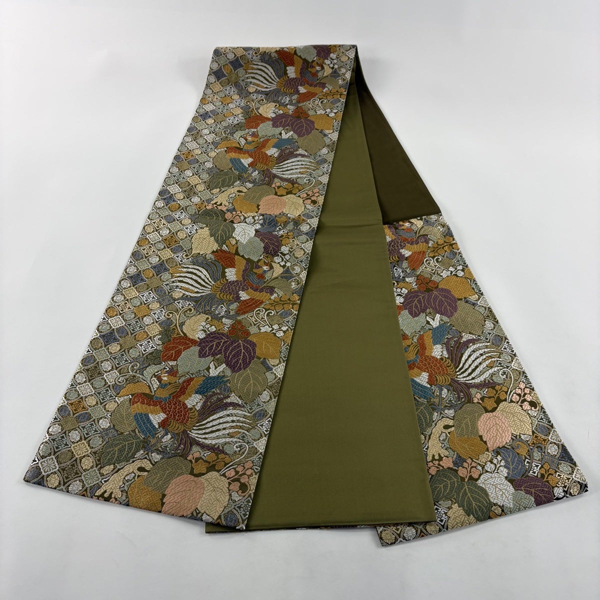【美品】 袋帯 名品 尾長鳥 七宝 箔 鶯色 六通 正絹