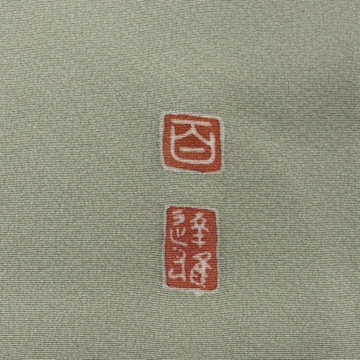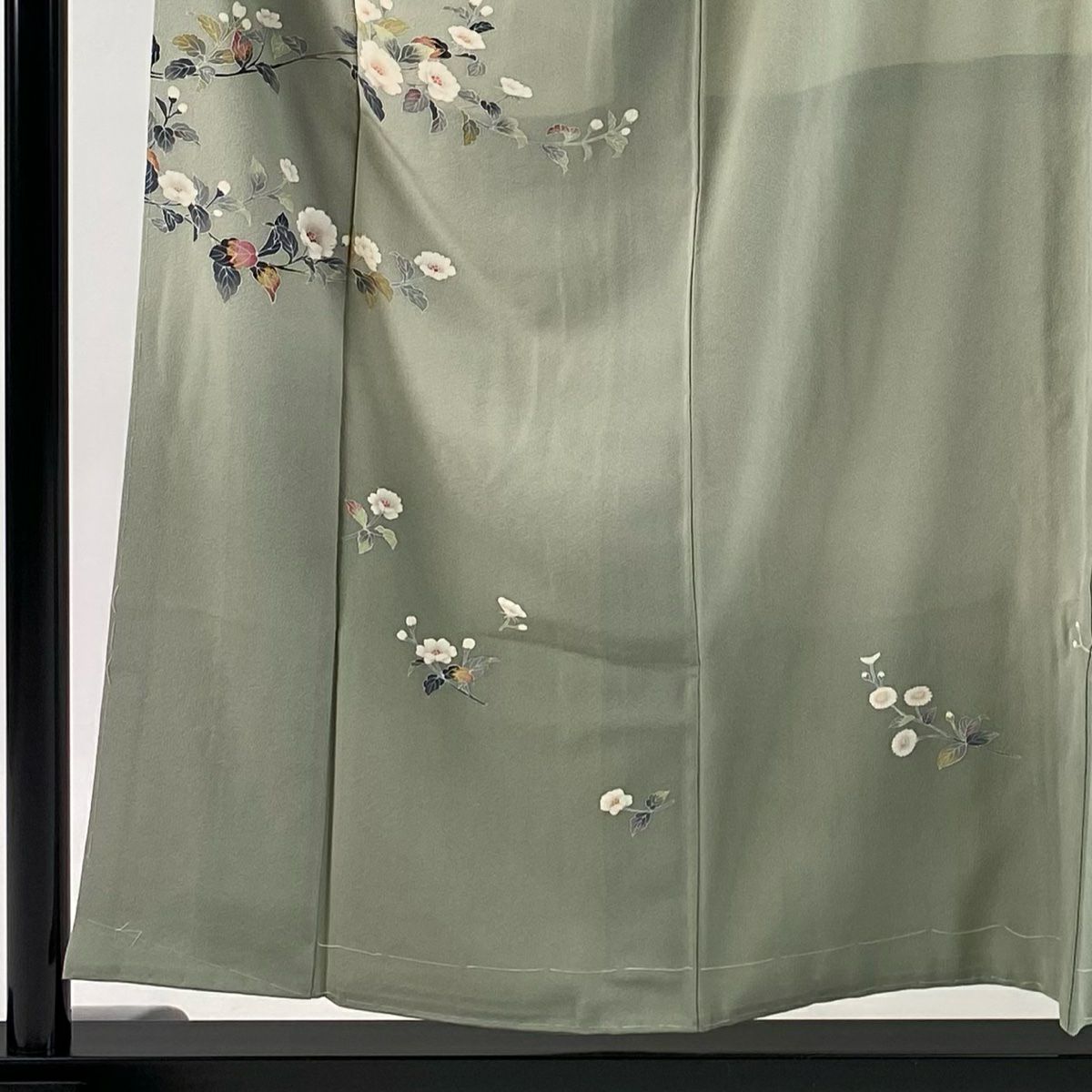 訪問着 身丈156.5cm 裄丈63cm S 袷 落款あり 草花 ぼかし 染め分け 鶯色 正絹 美品 名品 一つ紋