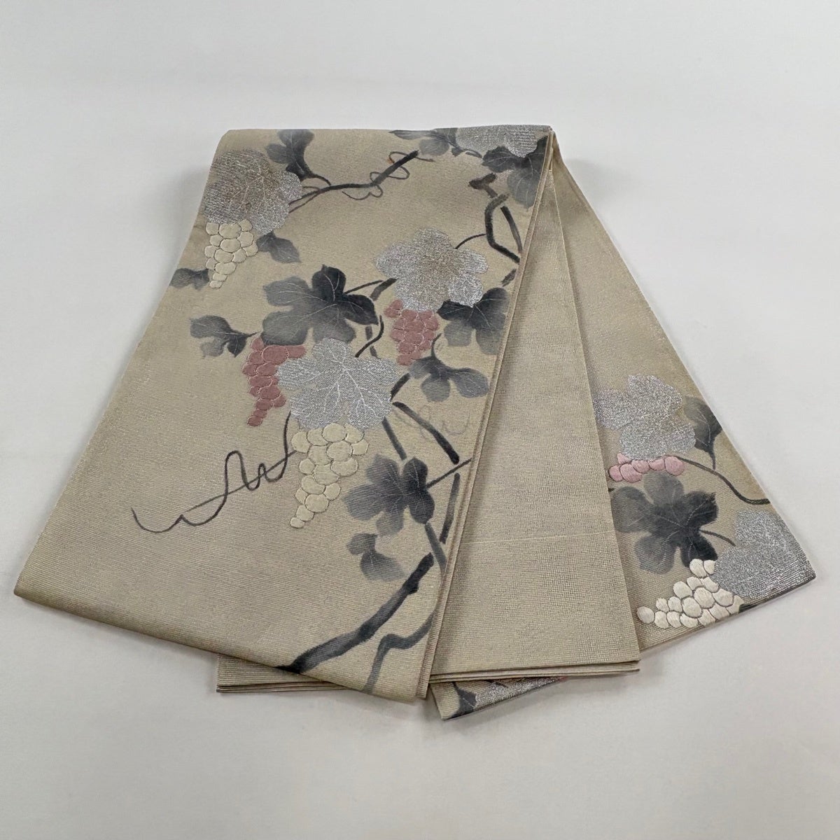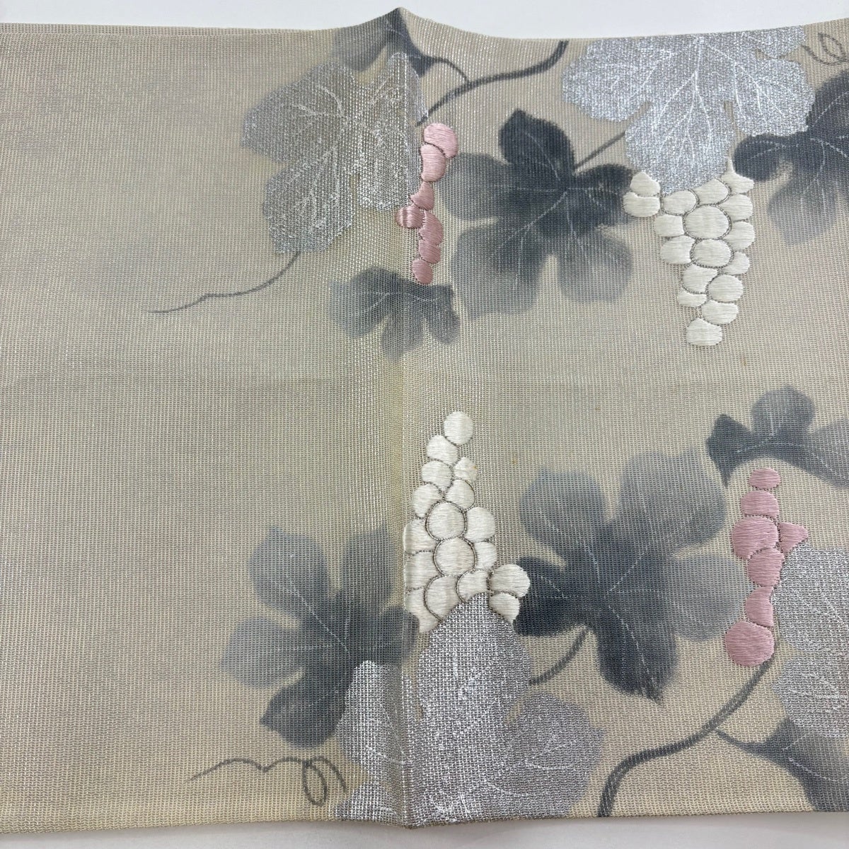袋帯 名品 夏帯 葡萄 銀彩 刺繍 クリーム お太鼓柄 正絹