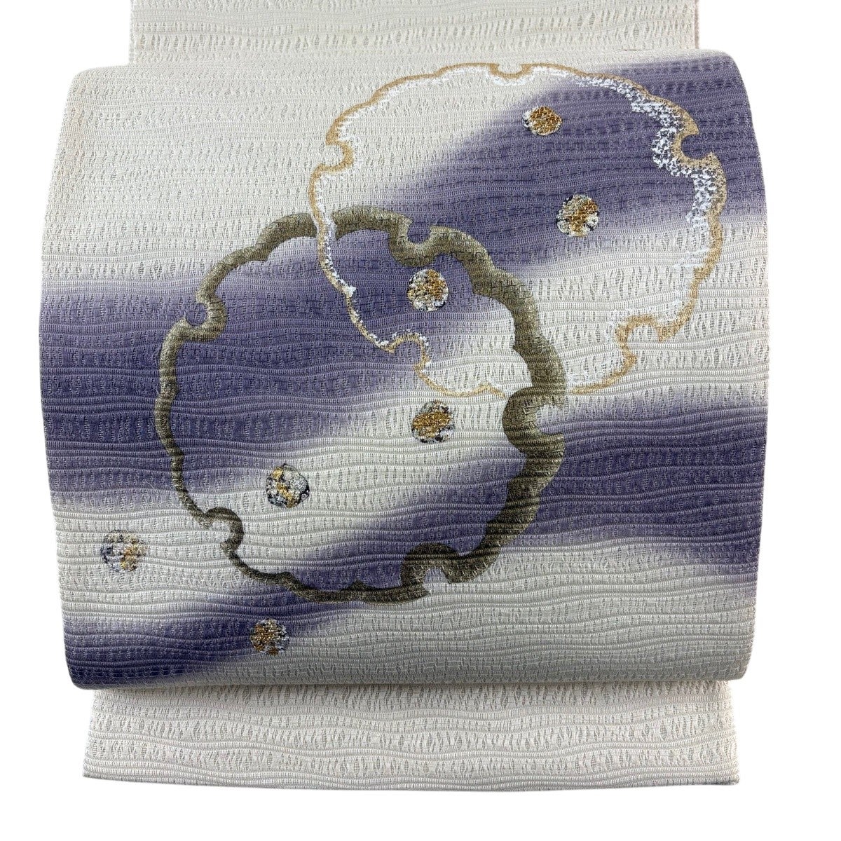 袋帯 名品 草木染 源氏香 草花 箔 刺繍 クリーム 六通 正絹
