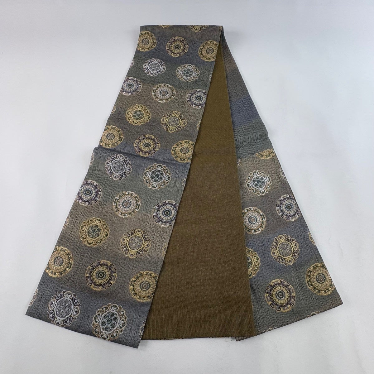 【美品】 袋帯 名品 辻が花 格子 銀糸 箔 灰緑 六通 正絹