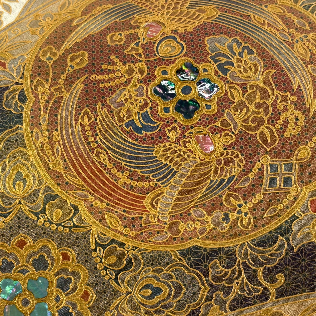 【美品】 袋帯 名品 花丸文 鶴 金銀糸 箔 金色 お太鼓柄 正絹