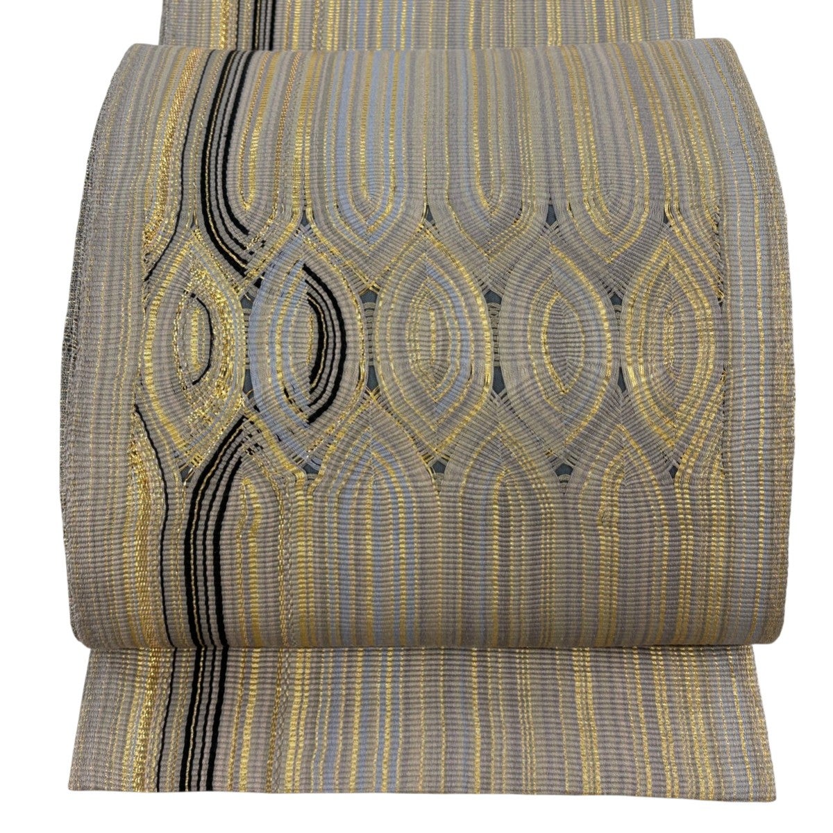 【美品】 袋帯 名品 幾何学 縞 金糸 ベージュ 六通 正絹