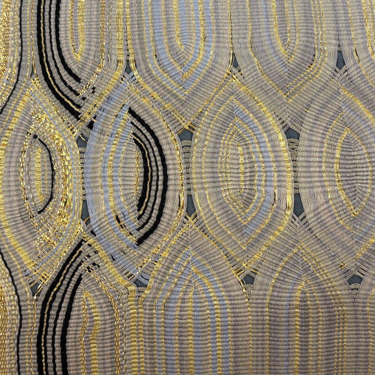 【美品】 袋帯 名品 縞 幾何学 金糸 箔 灰紫 お太鼓柄 正絹