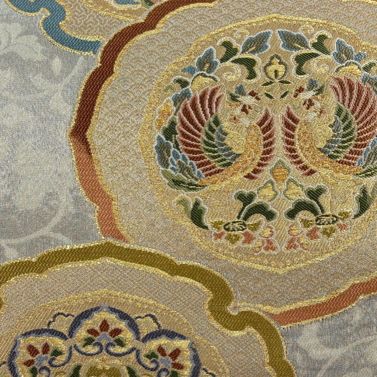 【美品】 袋帯 名品 草花 樹木 刺繍 金銀糸 灰色 六通 正絹