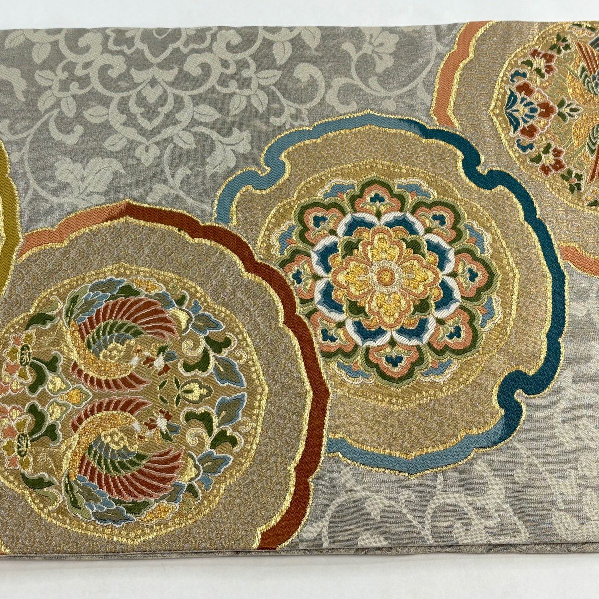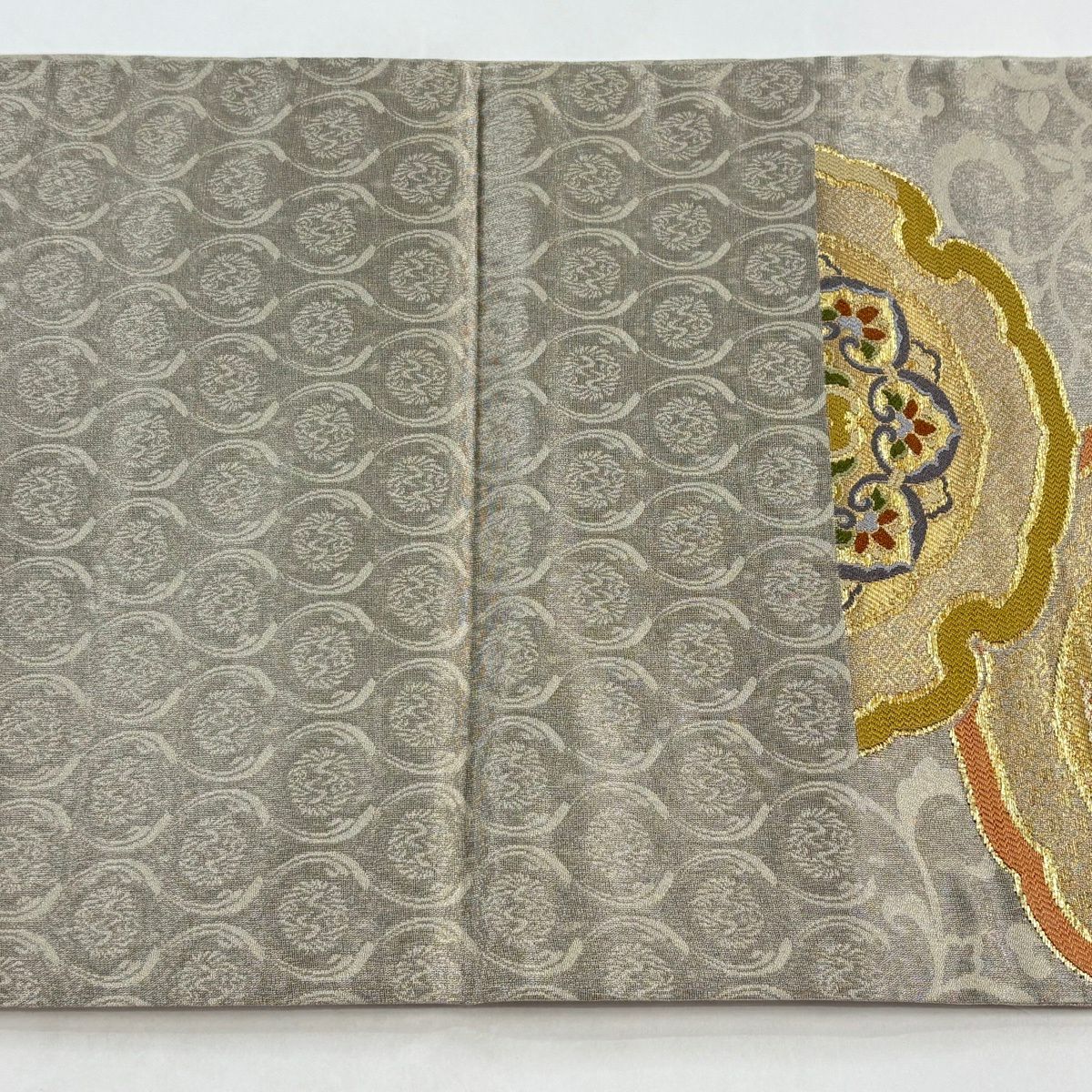 袋帯 名品 ペイズリー柄 唐草 金糸 箔 青灰色 全通 正絹