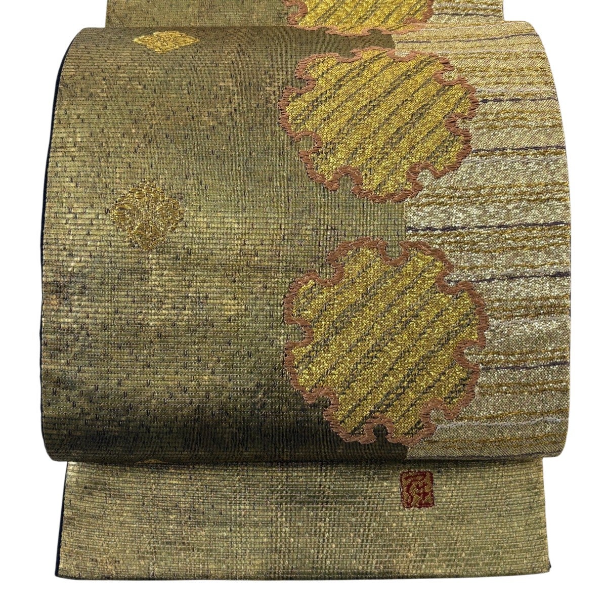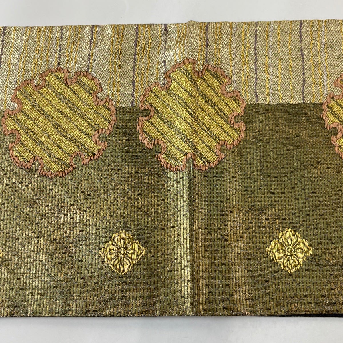 袋帯 名品 雪輪 縞 箔 金糸 鶯色 六通 正絹