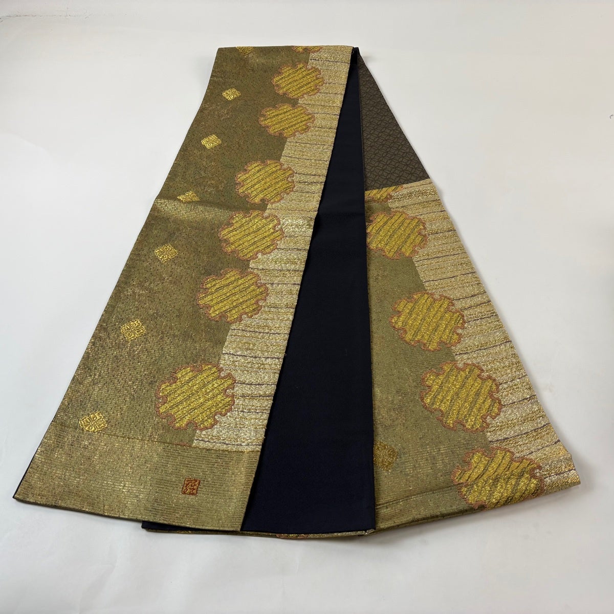 袋帯 名品 笠松 菊 箔 唐織 紺色 六通 正絹