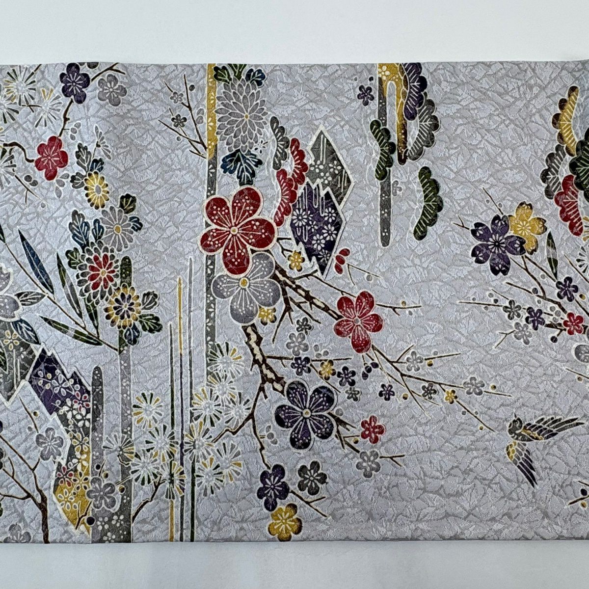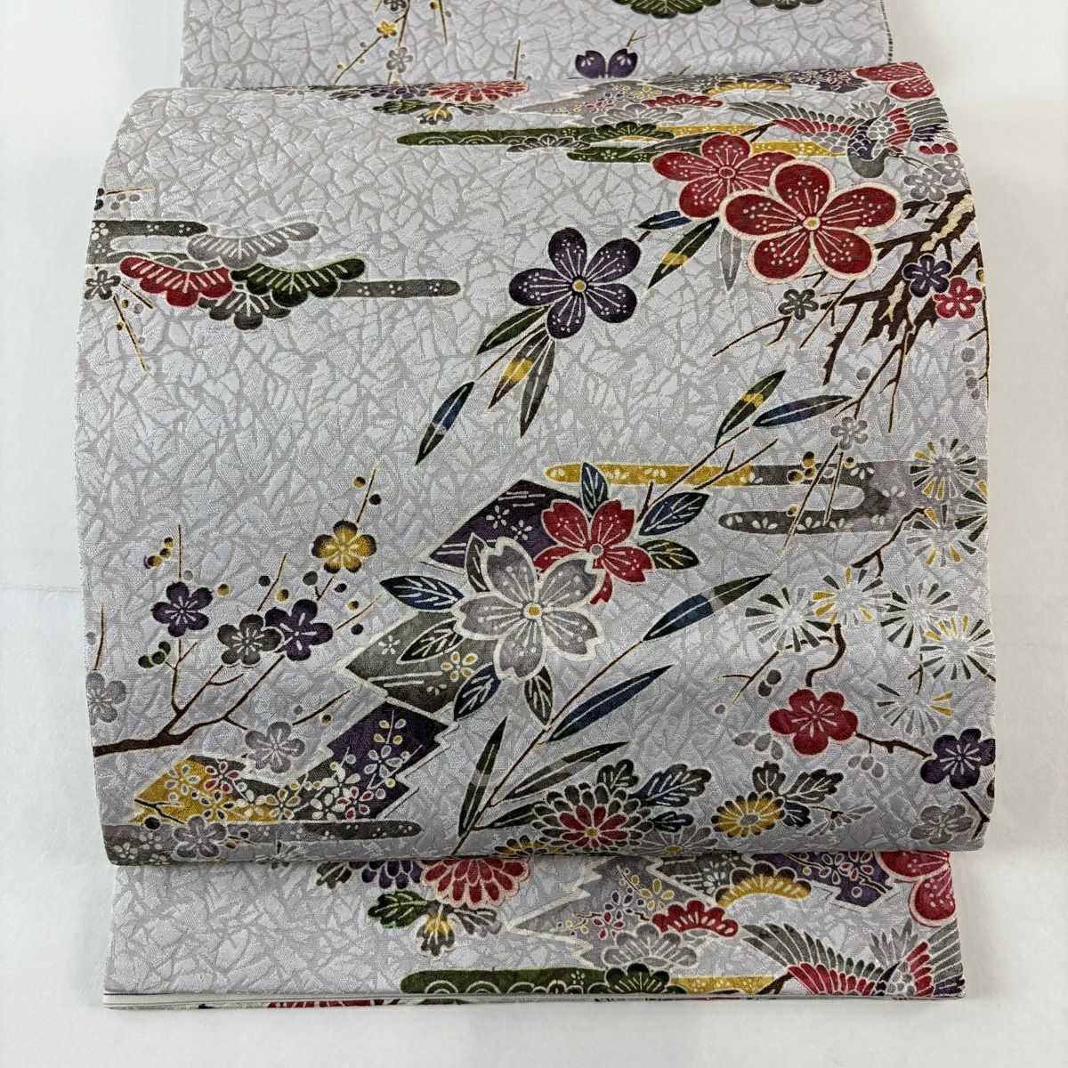 袋帯 名品 草花 鳥 金糸 箔 灰紫 六通 正絹