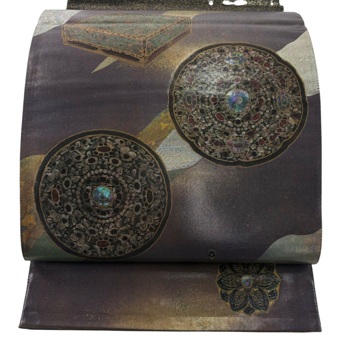 【美品】 袋帯 名品 関西仕立て 華文 楽器 金銀彩 箔 灰紫 お太鼓柄 正絹