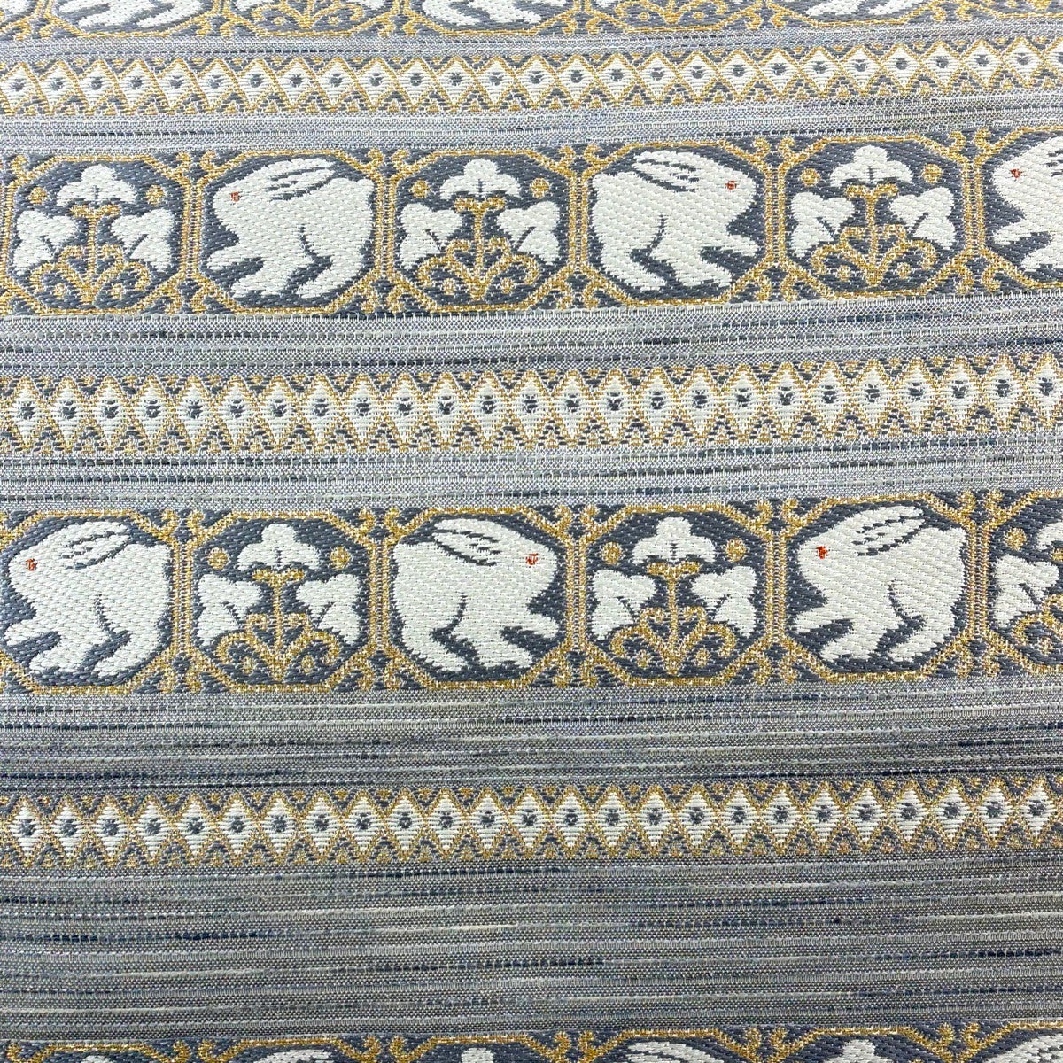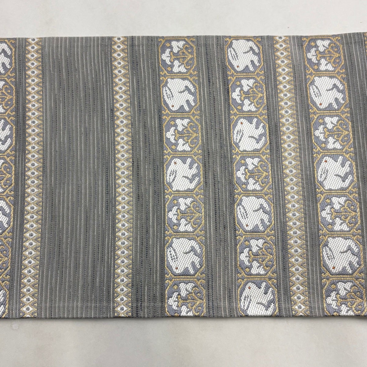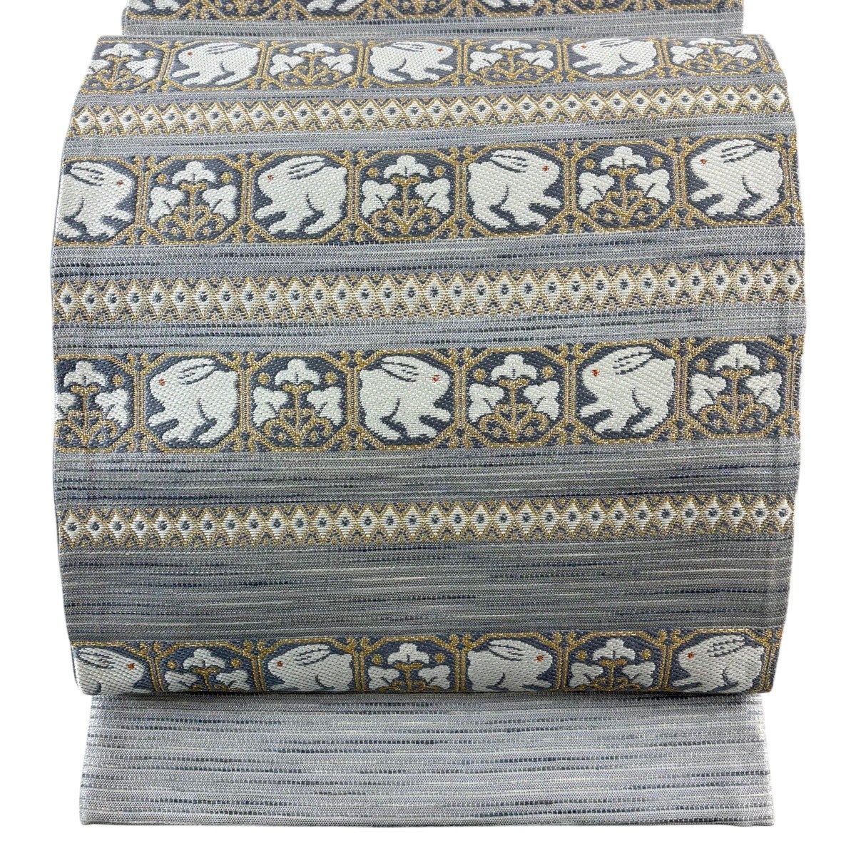 【美品】 袋帯 名品 証紙あり 岡文織物 うさぎ 草花 金糸 箔 灰色 六通 正絹