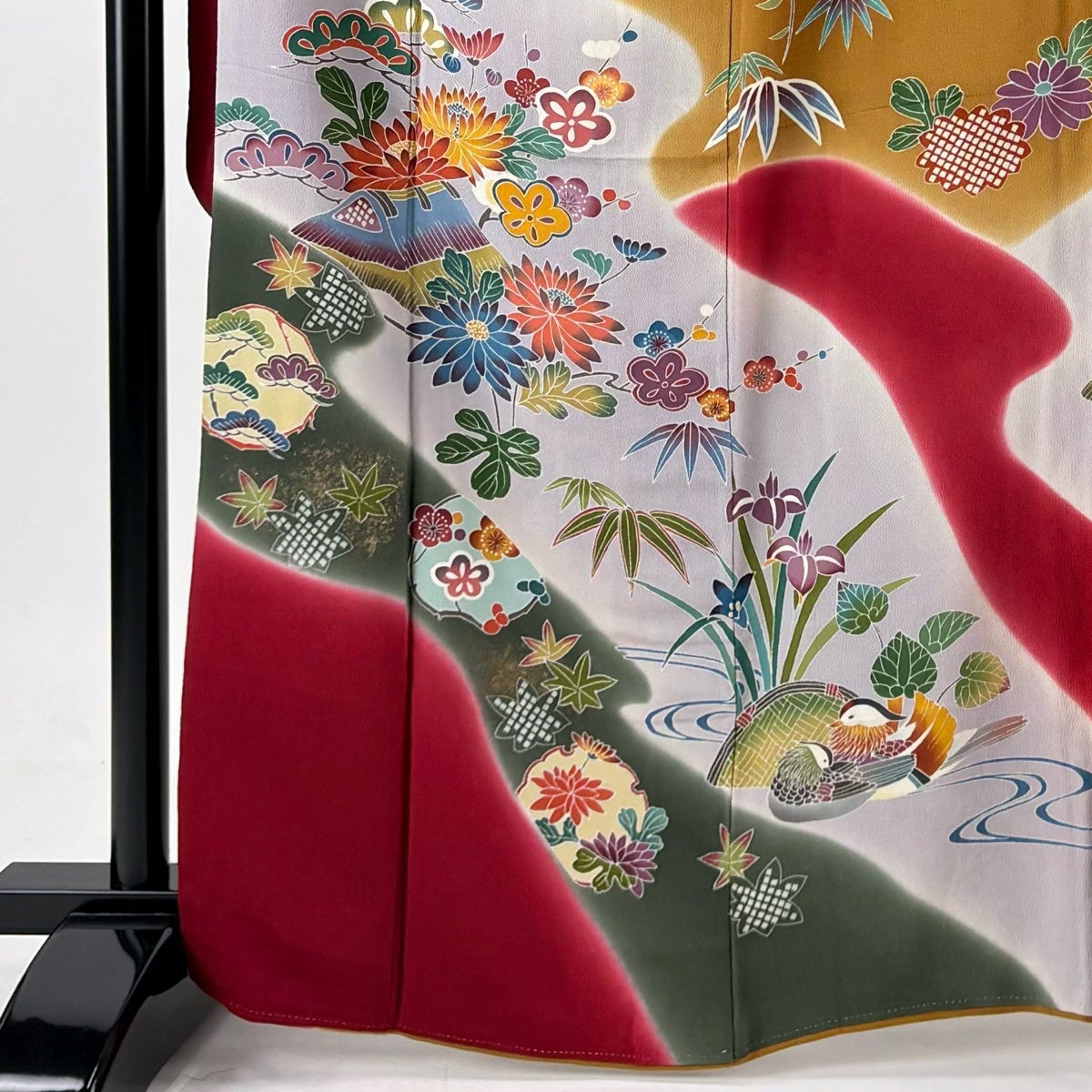 振袖 身丈165cm 裄丈65cm M 袷 松竹梅 家屋 金彩 染め分け 赤 正絹 名品