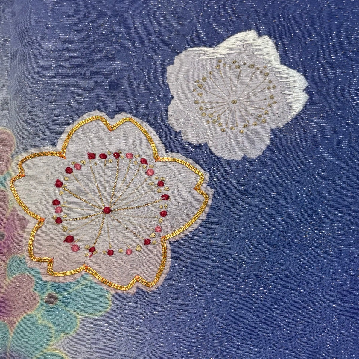 振袖 身丈164cm 裄丈68cm L 袷 桜 花びら 銀通し 金糸 青紫 正絹 名品